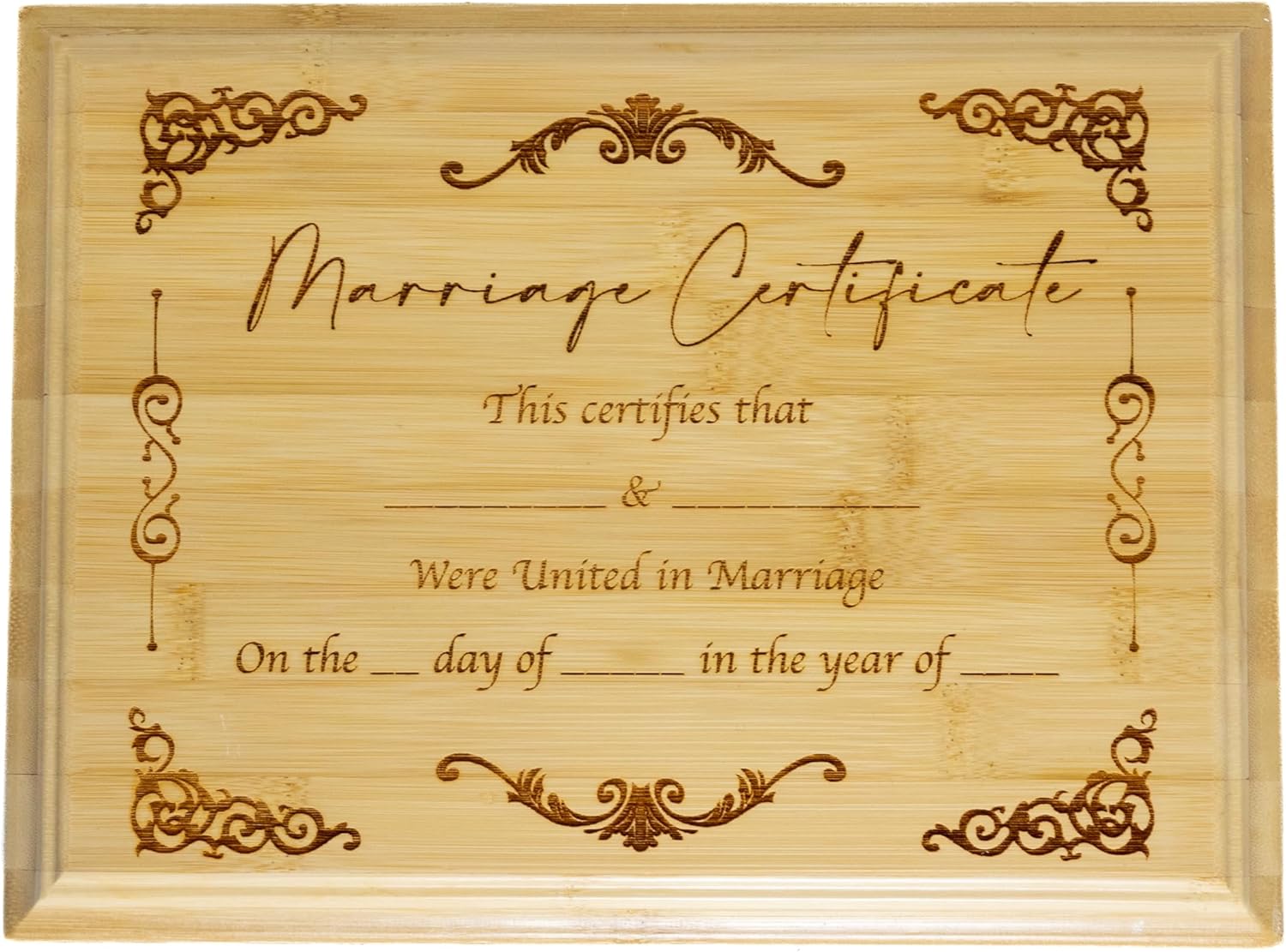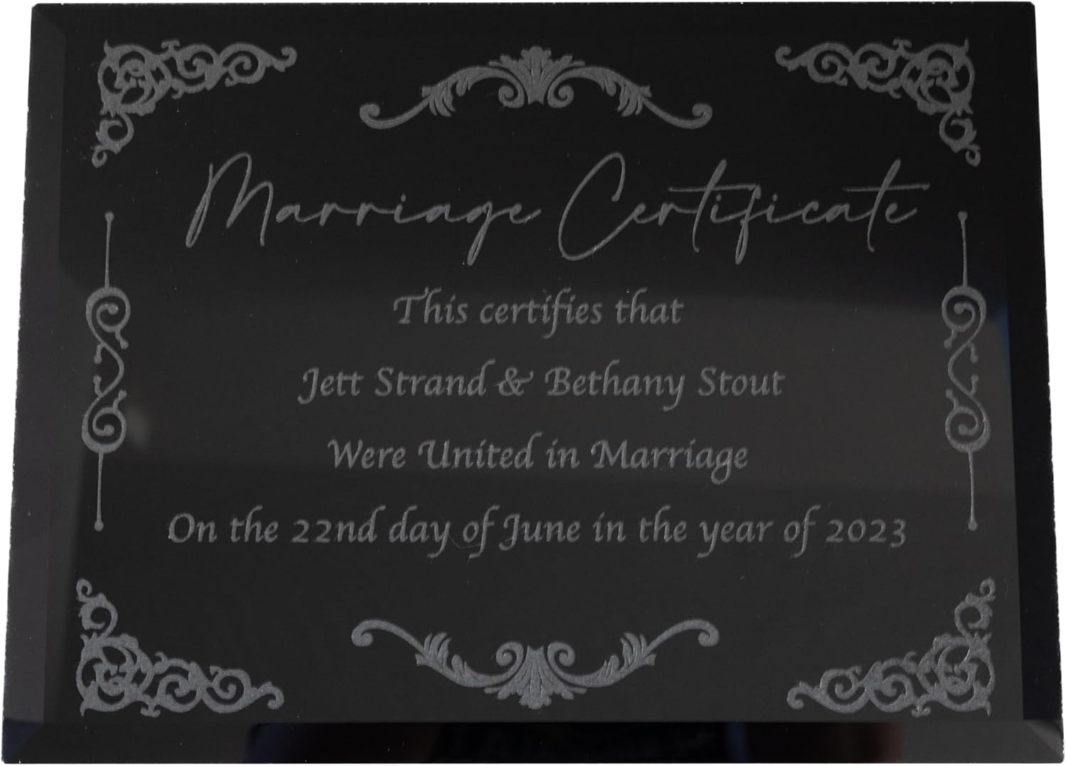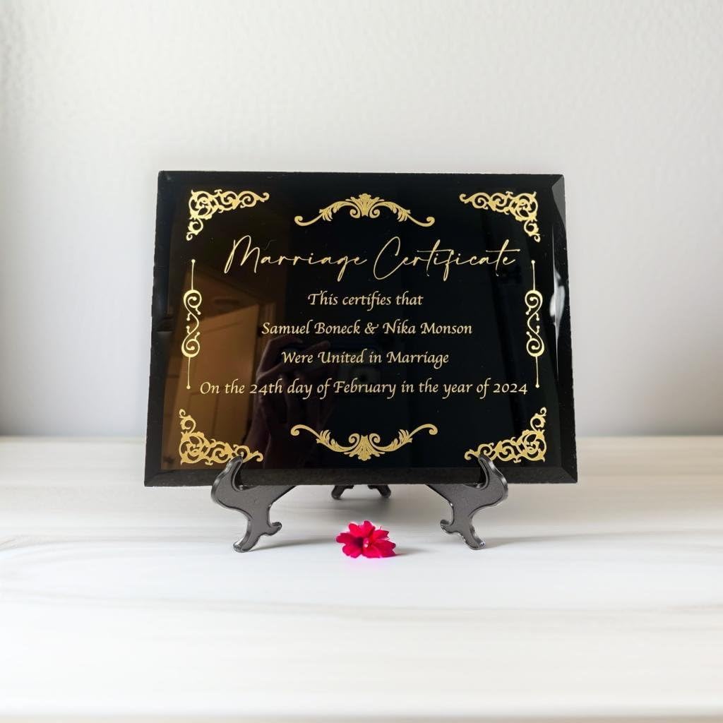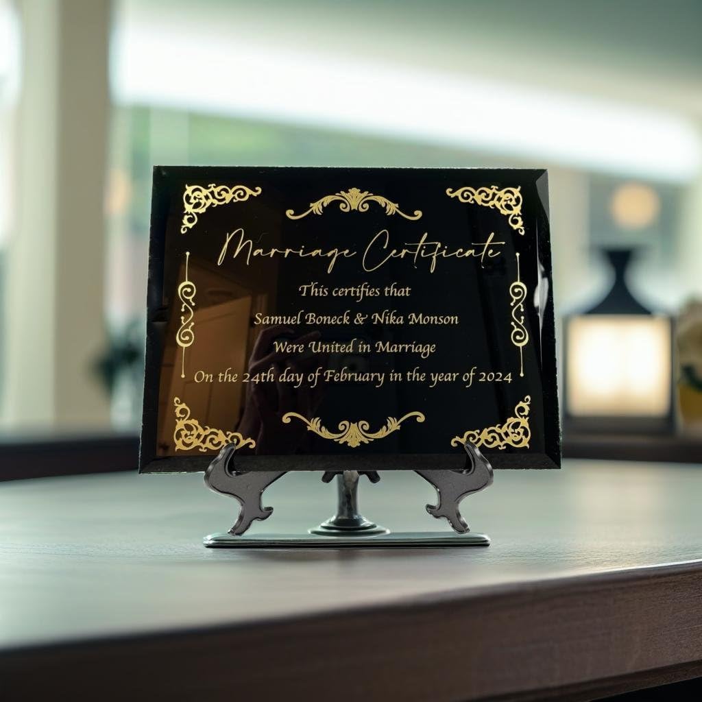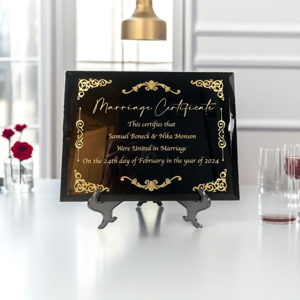 WHY BUY THIS PRODUCT? These Marriage Certificate Plaques would make the perfect wedding gift, anniversary gift, or just a way to commemorate your special day! You have the options to choose from Bamboo, Oak, Marble, Cherry, or Black Glass. They are engraved on a 9x12 inch plaque. Each of them is High quality and would serve as the perfect gift! WHAT MAKES US DIFFERENT? Each marriage certificate is perfectly centered on the plaque, they look crisp/aesthetic, and they ship out fast! If their is any problem with your order or shipping I work with the customer and do what is right (check my reviews for assurance).