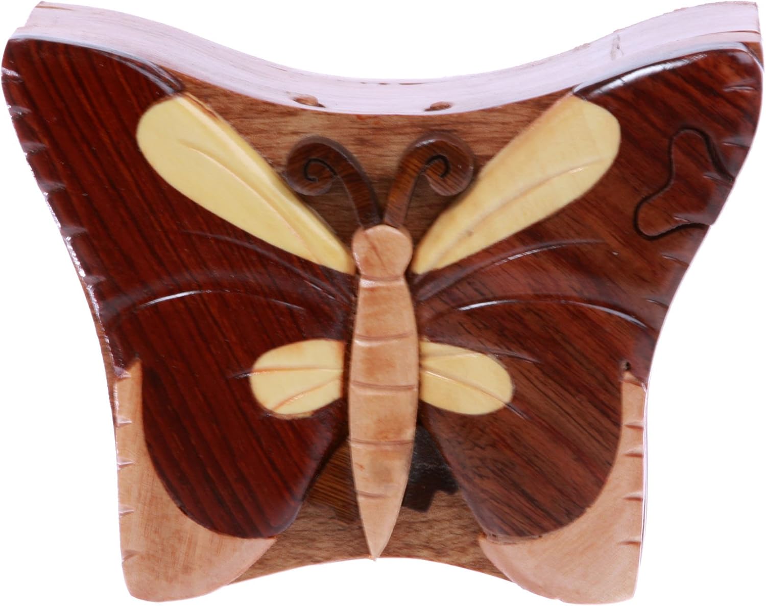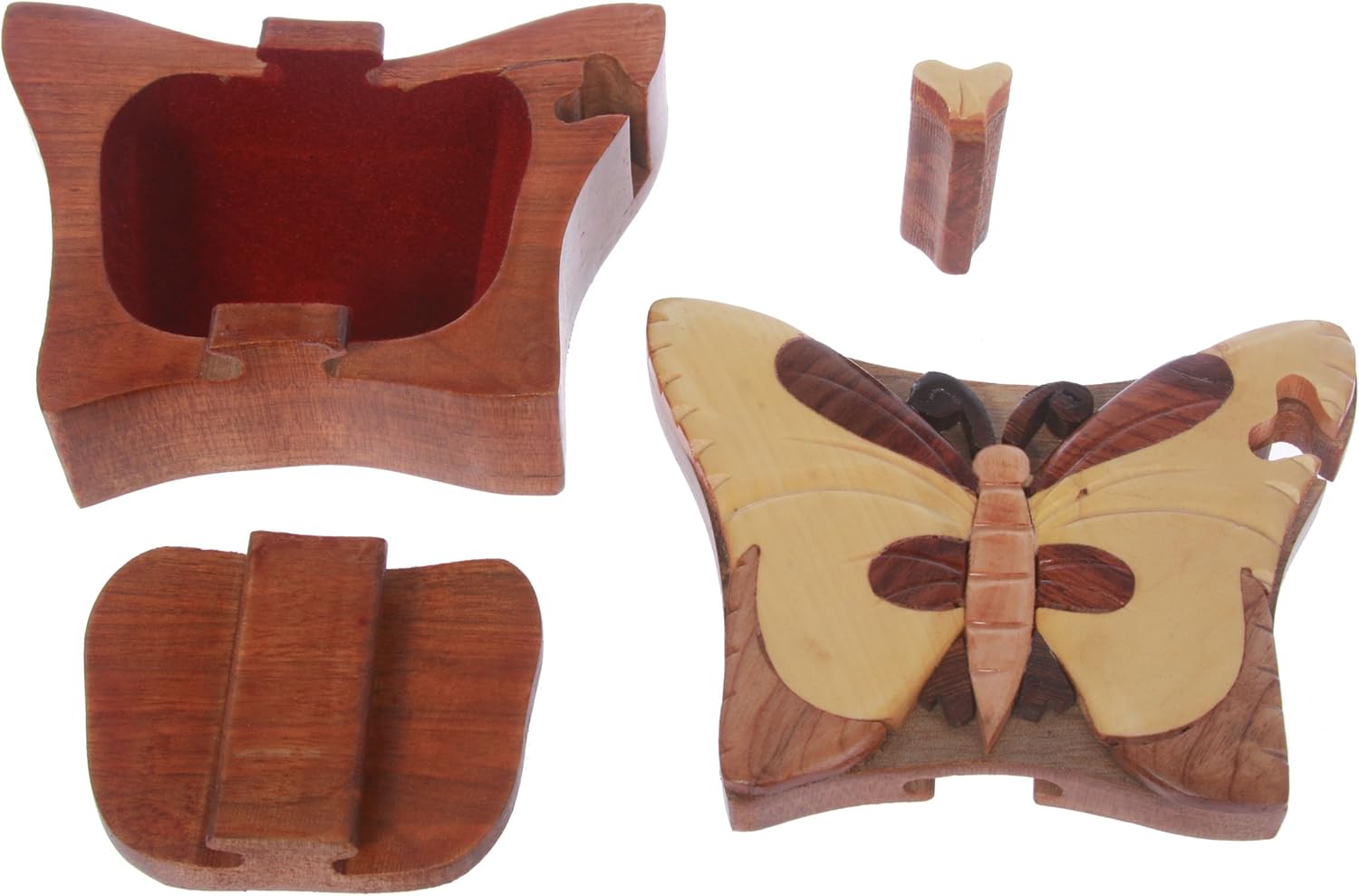 *This butterfly shaped Secret jewelry box can only be opened if you know the secret. Perfect gift for that special someone. Beautifully Hand Made Wooden Box with Hand-carved embossed butterfly on the lid. It has a secret locking device, although the big secret opening isn't all that difficult to figure out. It is brand new. Each individual box is unique, they may look different from each other since every part of the box is made of unique wood material *Every piece comes in the original manufacturer's packaging. The photos here show an example of the item for sale. The coloring, grain and stripes might be different piece to piece, due to their uniqueness *Exterior Dimension (L X W X D): 5"(13cm) X 3 3/4"(9.5cm) X 1 7/8"(4.8cm) *Interior Dimension (L X W X D): 2 1/2"(6.5cm) X 2 1/2"(6.5cm) X 3/4"(2cm) *It is simple, well made, and useful for jewelry, money, or anything small in size you want storage for. *You will get a lot of compliments on it
