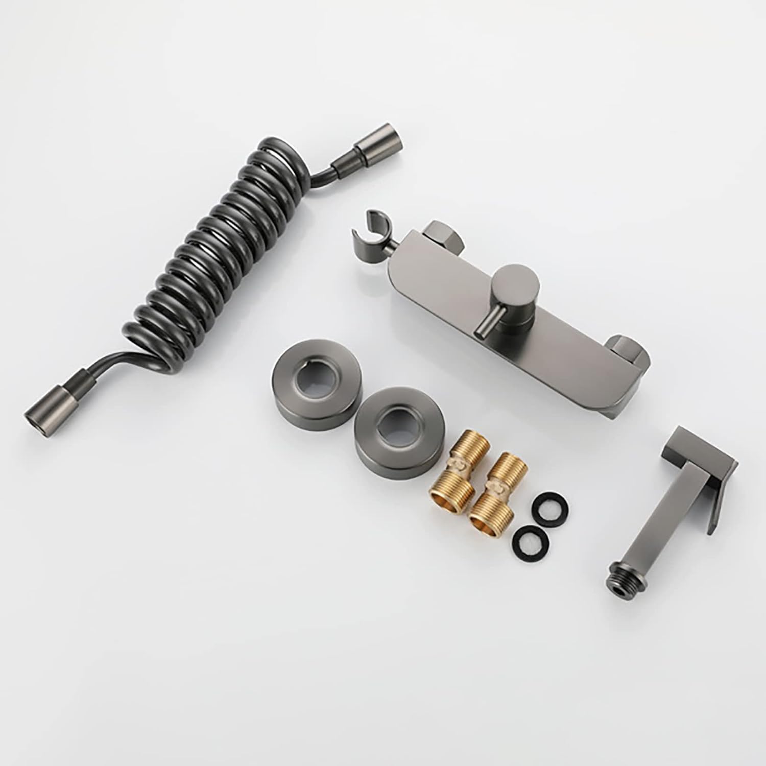 Sprayers Great for bathing pets, cleaning diapers, or feminine hygiene Incremental pressure system lets you spray as gently as needed Can be used to help you clean the bathroomSpecification:Product Name: Bidet Sprayer for ToiletStyle: ContemporaryColor: GrayInstallation Type: Wall mountHot & Cold Water YesCold Hot Water Control Type: Single Holder Dual ControlNumber of Handles: Single handleInstallation Holes: 2 holeInstallation Hole Distance: 15cm (13.5-16.5 cm, adjustable)Shower Hose: 1.5mConnection: G1/2"Material:Faucet Body Material: BrassHandheld Sprayer Head Material: BrassShower Hose Material: 304 Stainless Steel● Package Included: 1 x Faucet Body1 x Bidet Sprayer Head1 x Shower HoseWarm Tips Rinse the debris in the pre-embedded water pipe before installation to avoid clogging the faucet and internal piping. Since the size is measured manually, there is a 1-3 mm error. Please refer to the actual product. The picture is the actual product. However, slight chromatic aberrations may occur due to different lighting and display settings.
