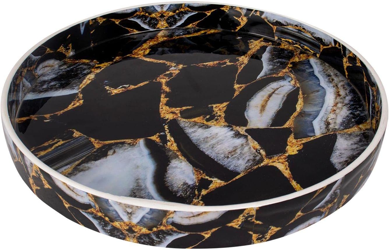 At HANDICRAFTS HOME, our mission is to transform your home decor into a sanctuary of tranquility and peace by providing unique, bespoke products and accessories that will impress with gorgeous aesthetics and practicality. We rely on talent of skillful artisans and high-quality materials to create beautiful products that will bring a touch of elegance and style without compromising functionality. Our accessories are carefully tailored to adapt to any settings, enriching and adding a sophisticated note to any decor while making your life easier and more enjoyable. Not completely pleased with your order? Don’t worry, we are always at your service to address any issues or concerns.Still not convinced? Here are some of the amazing features of this round tray:Dimensions: 12 inch diameter;Material: resin inlay, pine MDF;Cosmos collection will nicely compliment any space, living room, bathroom, kitchen, bedroom;Versatile uses, works as decorative centerpiece, serving tray, coffee table tray, for snacks, aromatic candles and oils, jewelry, makeup, desk organization;Durable and sturdy design;Non-chipping, easy to clean;Round shape with tall edges for easy and non-slip grip;Lovely gift idea for housewarming, new home owners, wedding registry, birthday, special occasions.You’ll fall in love instantly with this sophisticated and modern accent tray!
