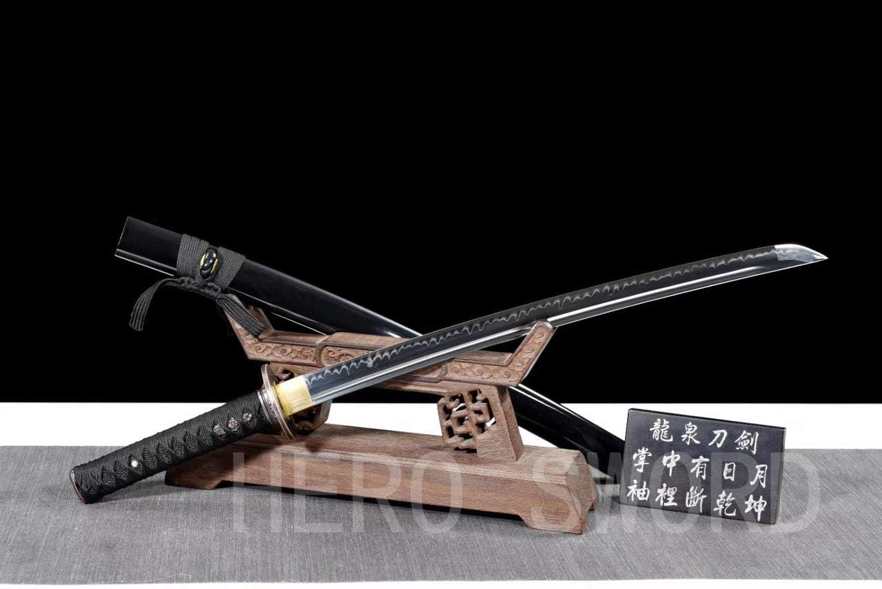 Specification Blade material ;Clay Tempered T10 steel HRC ;Blade edge hardness 60,blade back hardness 55 Tang; Full tang Sharpness ; can easily cut trees and bamboo/A4 paper,Razor sharp! Bo-hi;with long hi on each one side Kissaki;Chu-kissaki KATANA Length; overall length ;103cm/40.55 inches blade length ; 70 cm/27.56 inches handle length ;26cm/10.24 inches blade width ; 3.2cm/1.26 inches Wakizashi length; overall length ;70cm blade length ;50cm handle length ;20cm blade width(near habaki) ; 3.2cm blade thickness (near habaki);0.7cm Tanto length; overall length ;50cm/19.68 inches blade length ;30cm/11.8 inches handle length ;16cm/6.3 inches blade width(near habaki) ; 3.2cm/1.26 inches blade thickness (near habaki);0.7cm/0.28 inches tsuba material ;alloy Kashira/Fuchi/menuki material ;alloy handle material ; hard wood + silk ito + ray skin saya material ; hard wood+silk sageo Conditional ;brand new gift ; black sword bag Note;below sword picture show black sword stand not included