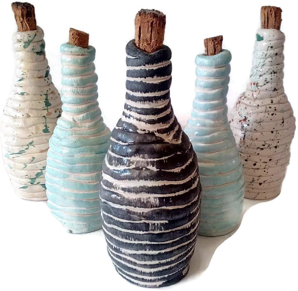 This charming ceramic bottle with a natural cork stopper is very versatile. It would look lovely as a decoration in a country home, modern space, or contemporary area. An eye-catching decorative bottle vase, with interesting irregularities and textures. This bottle is also functional and can hold any liquids you like. It also can be used as a cruet or potion bottle.