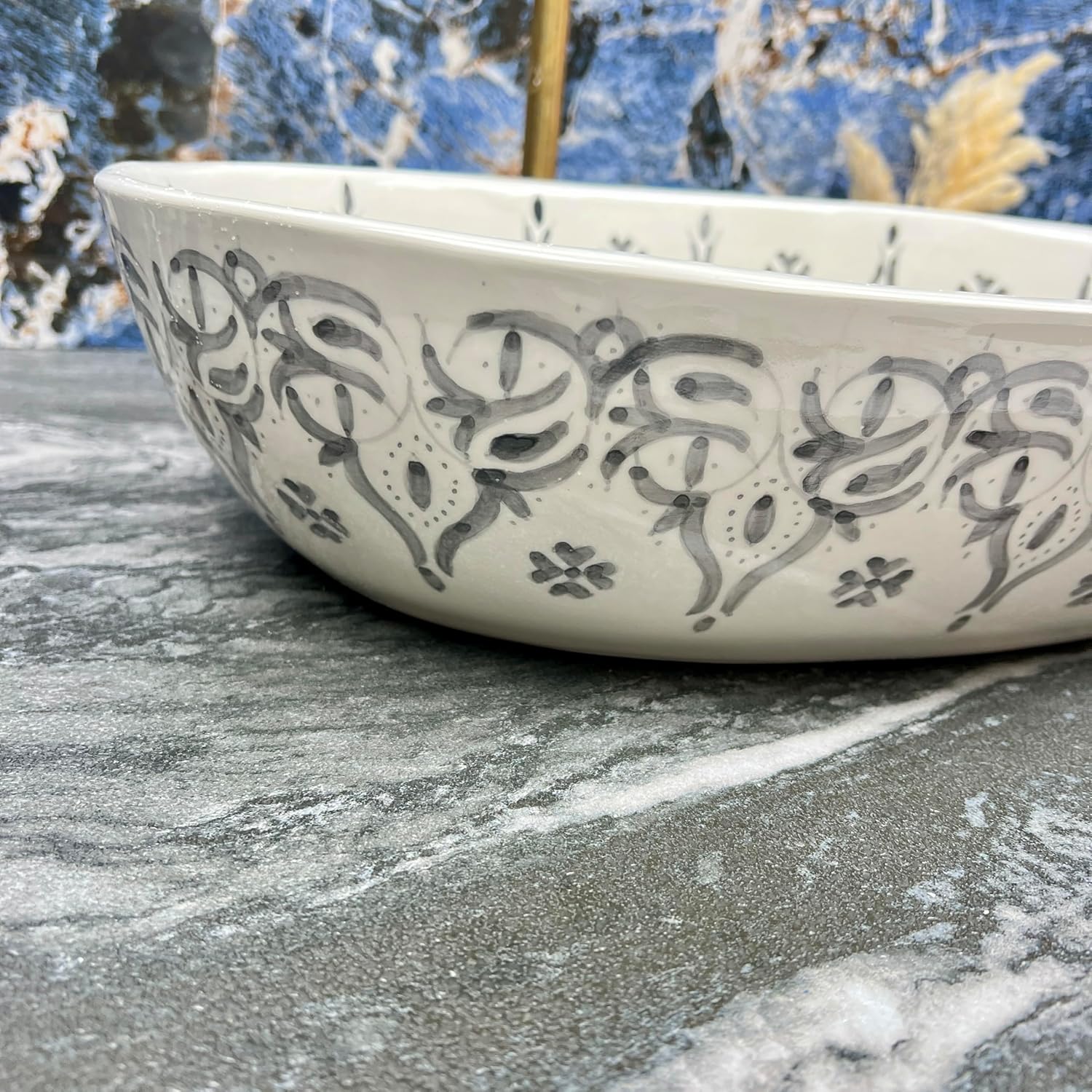Bring a sense of calm and organic beauty to your bathroom with this Grey & Cream Hand-Painted Vessel Sink. If you love the "Modern Mediterranean" or "Scandi-Boho" aesthetic, this washbasin is the perfect finishing touch. It offers the intricate beauty of traditional Moroccan pottery but in a modern, understated color palette. Why this sink is unique: The Color: Unlike the high-contrast black version, this sink uses a soft watercolor grey. It is gentle on the eyes and blends seamlessly with neutral bathroom tones like beige, sand, and white. The Texture: The hand-painted motif provides a visual texture that breaks up the flatness of modern manufacturing, adding warmth and character to your vanity. The Versatility: As shown in the photos, it pairs elegantly with antique brass or gold faucets, but it would look equally stunning with brushed nickel or matte black hardware for a more contemporary look. Ideal For: Master bathrooms seeking a serene, spa vibe. Neutral nurseries or guest bathrooms. Farmhouse renovations requiring a soft, vintage touch. Please note: Due to the handcrafted nature of the pottery, the intensity of the grey glaze may vary slightly, making your sink truly one-of-a-kind.