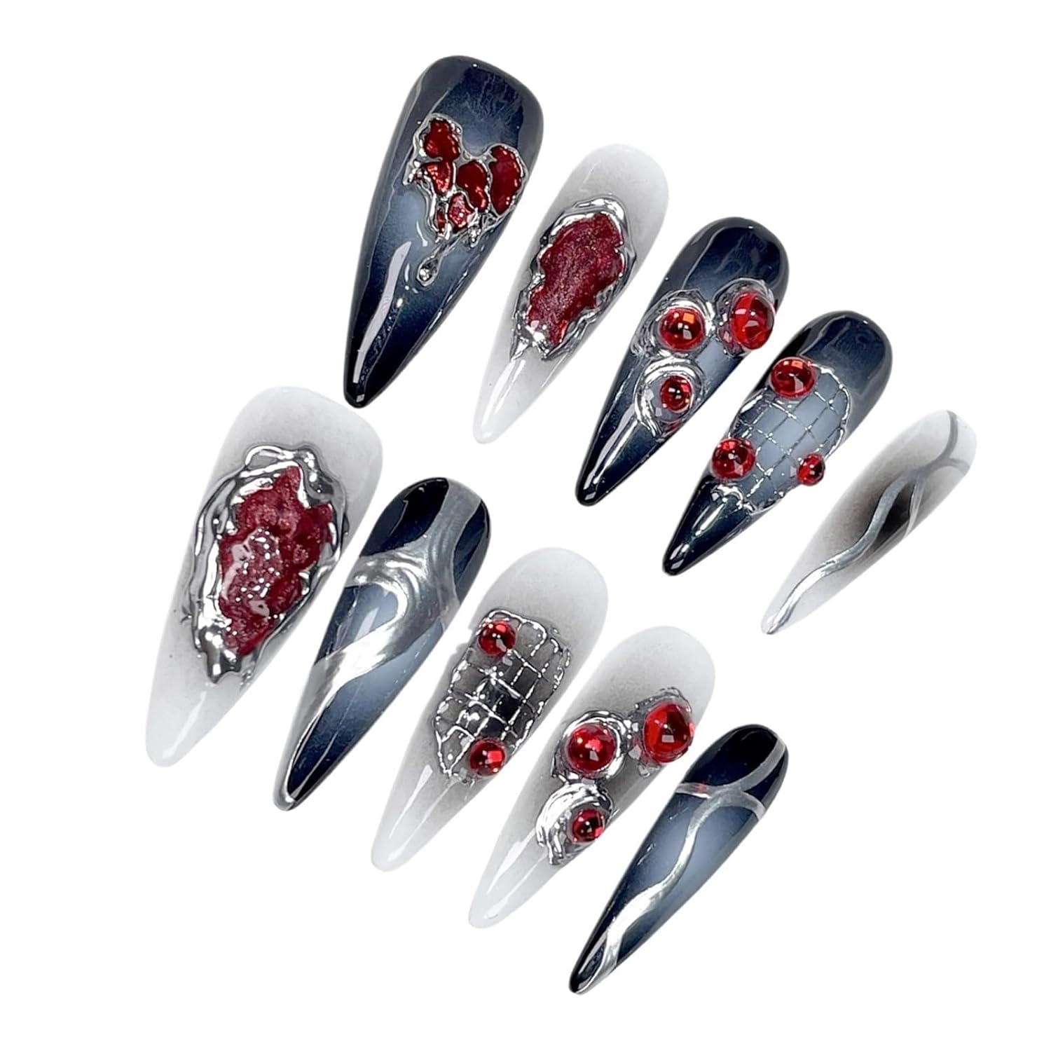 Size,Thumb(mm),Index(mm),Middle(mm),(mm),Pinky(mm)XS,14,10,11,10,8S,15,11,12,11,9,16,12,13,12,10L,17,13,14,13,1110PCS*Artificial Nails1*Nail Files1*Jelly Glue SetMaterial : RESINNumber of Pieces : 10pcs