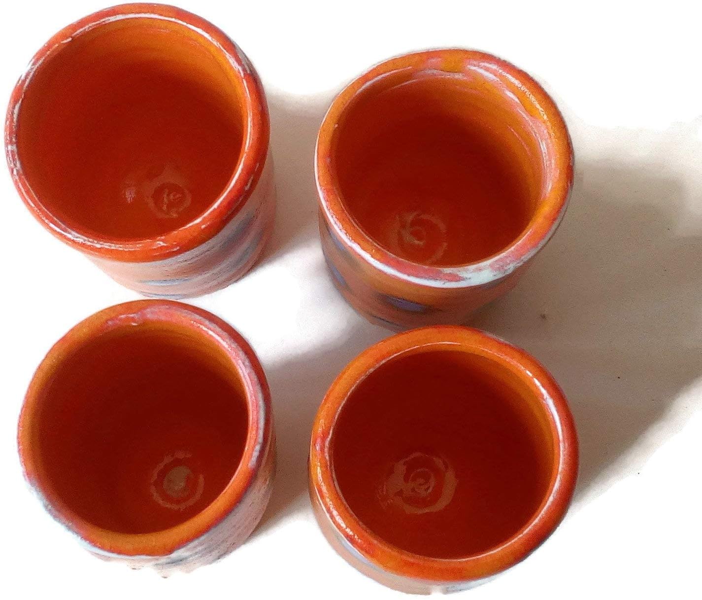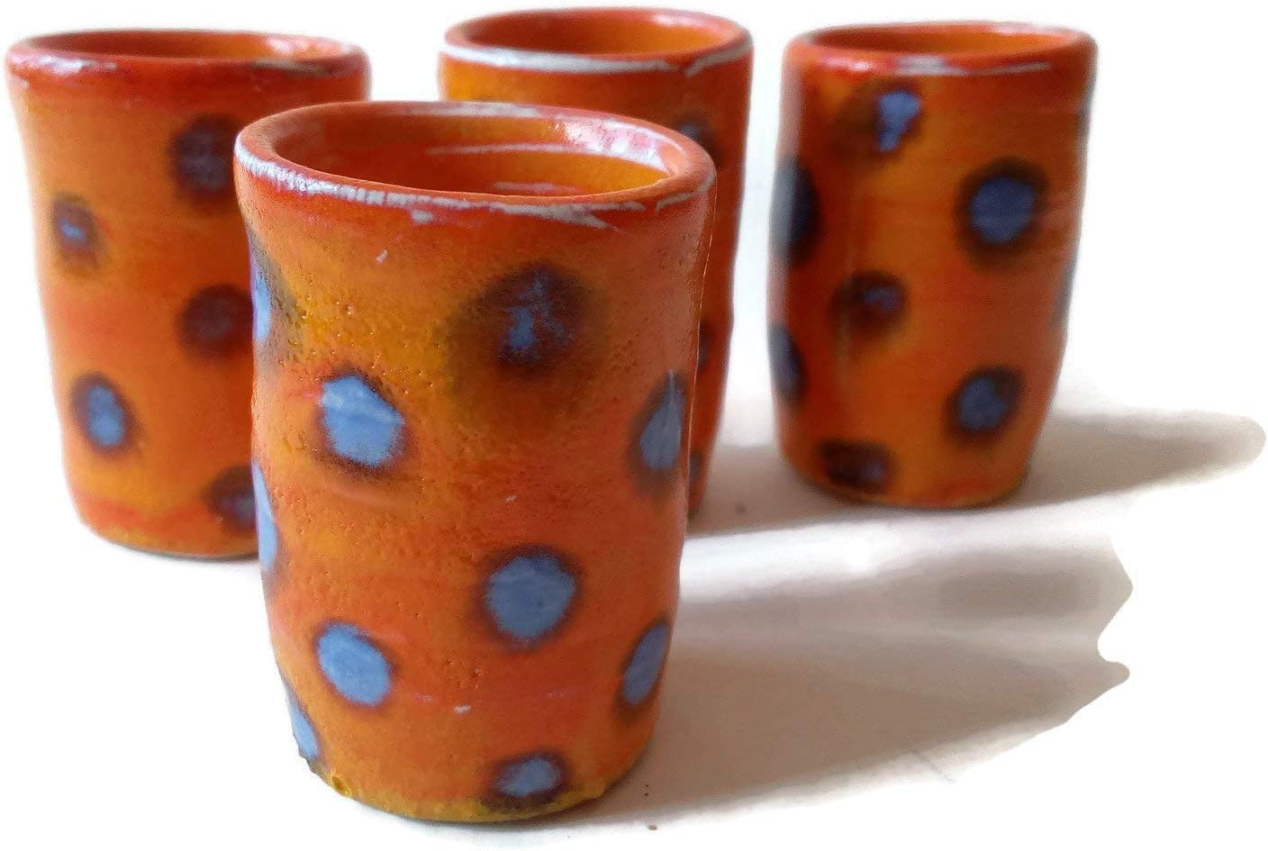 Handmade Set of 4 Shot Glasses.These small, one of a kind, orange ceramic shot glasses with blue spots are great barware, hostess and bachelor/ bachelorette gifts and birthday presents.My handmade cups are hand-thrown on a potter’s wheel and carefully handpainted in vibrant orange.They are also perfect as an espresso cup and are smooth to touch.Surprise someone special today!These handmade ceramic shot glasses measure 3.5cm in diameter (1.4inches), and 5cm tall (1.97inches).** EXTRA INFORMATION: My ceramic glasses are kiln fired, glazed and refired for durability.All materials are lead-free.Food safe and dishwasher friendly, although handwashing is recommended..Handmade, with rustic irregularities.The price is for one set of 4 glasses.