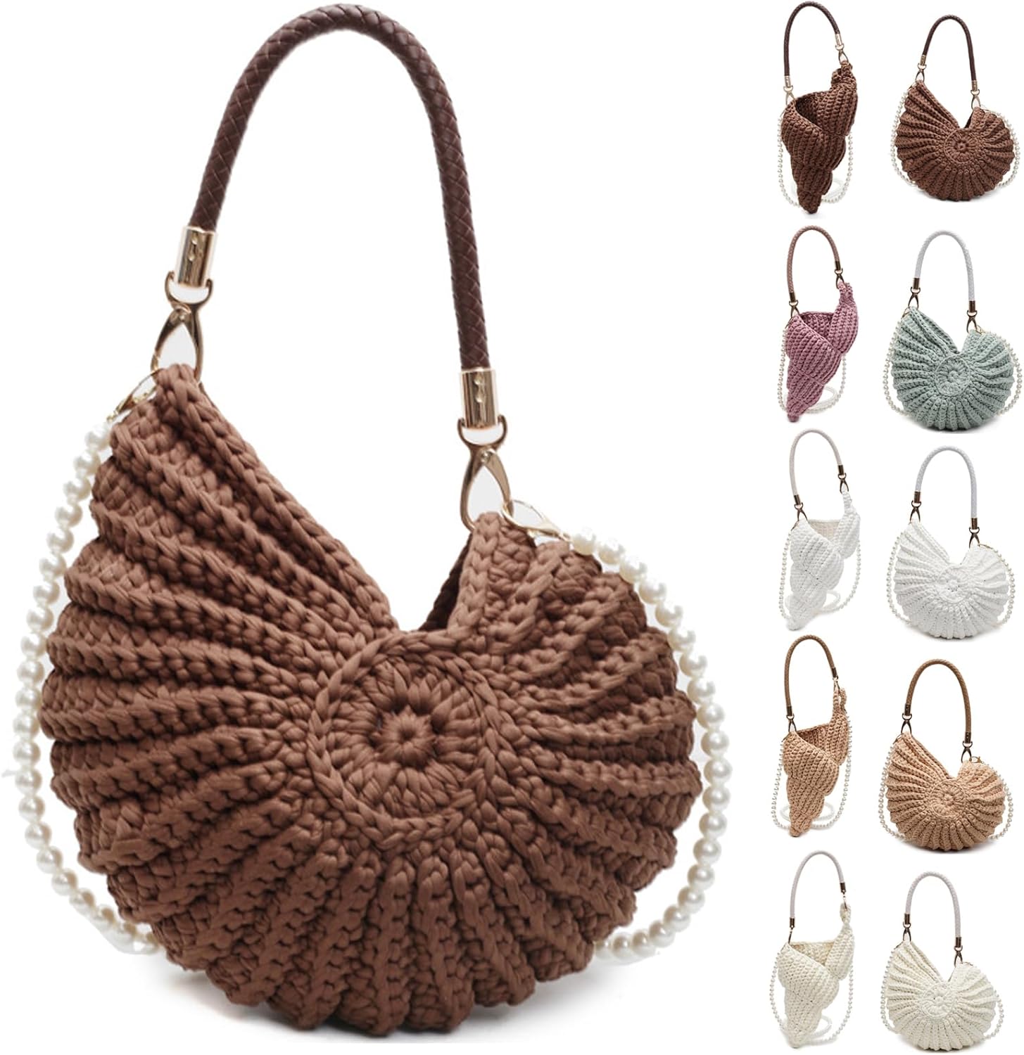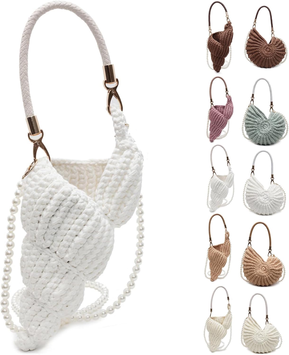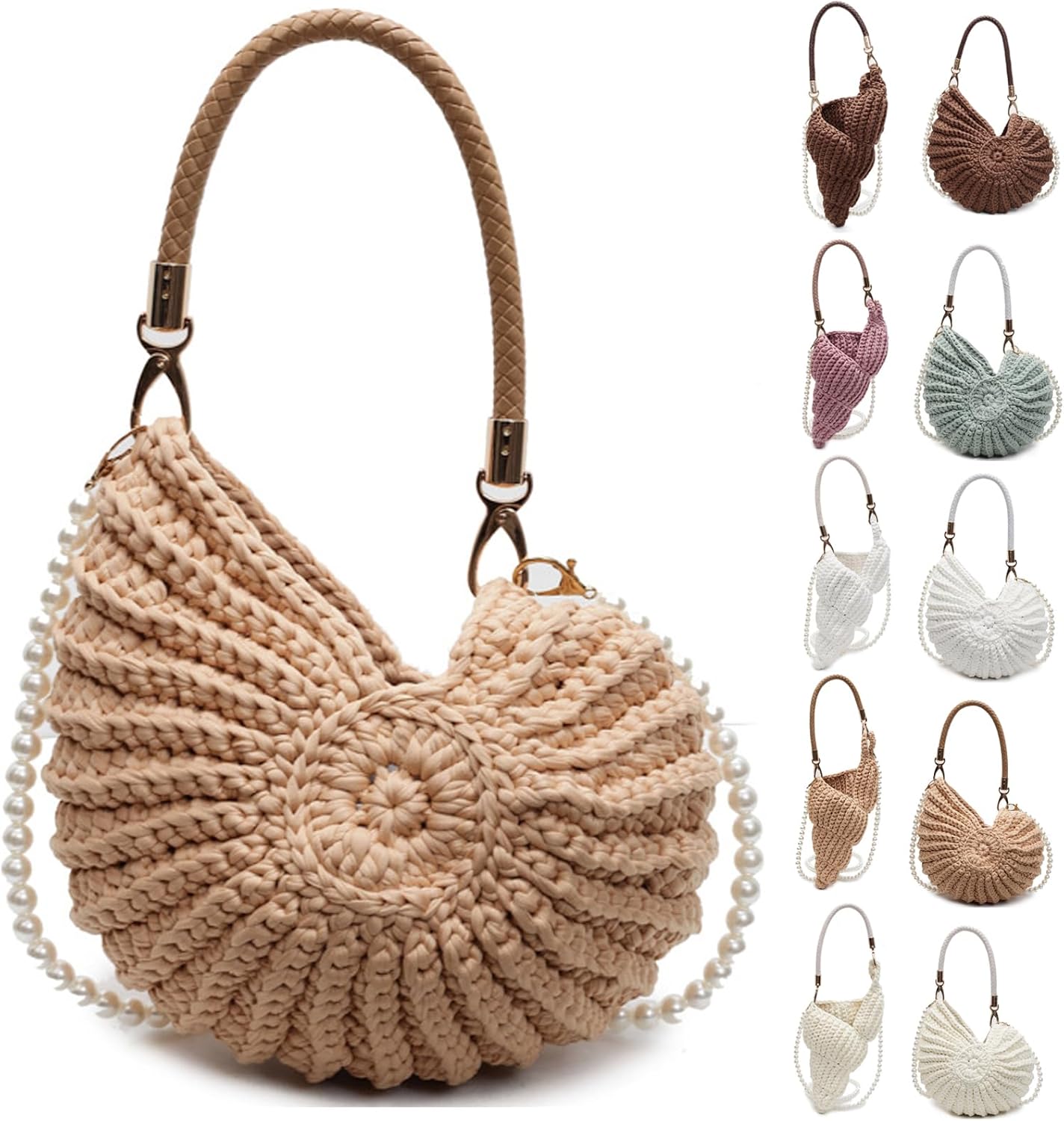 crochet clutch Handwoven Crochet Purse Coastal Elegance for Every OccasionCrafted with meticulous care, this handwoven sea shell purses for women combines artisanal charm with practical design. Measuring 10.24”x3.94”x10.63”, its spacious interior effortlessly holds phones, keys, cosmetics, and daily essentials, making it an ideal summer beach tote, beachy purse, seashell clutch purse,vacation-ready shoulder bag, or stylish crossbody purse for women seeking both functionality and flair.Versatile & Adjustable for Effortless StylingSwitch between two carrying modes:Short leather handle for a classic handheld clutch or shell-shaped shoulder bag.Detachable pearl chain strap to transform it into a trendy crossbody bag or evening shell clutch purse. Whether you’re strolling along the shore, attending a festival, or heading to brunch, this bag adapts seamlessly to your lifestyle.From Beach Days to Date NightsThis multi-functional shell handbag isn’t just for the seaside! Use it as:A stylish beach bag for towels and sunscreen.A chic shell clutch purse for weddings or parties.A spacious crochet tote for farmers’ markets or daily errands.A unique bohemian gift for birthdays, anniversaries, or holidays.