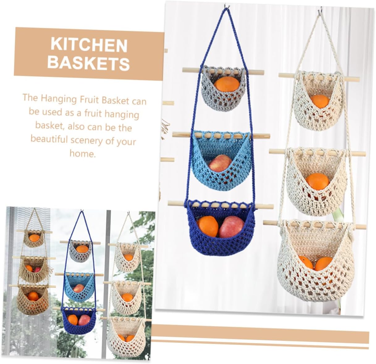 Package List 1 x Hanging Fruit Basket Characteristics -Material:Cotton rope Multi-function Fruit Basket -Color:Beige Kitchen Hanging Basket - Size: 83.00X33.00X10.00cm/32.62X12.97X3.93in onion storage basket -Product Info:Fruit and vegetable hanging basket - Put your fruits and vegetables in this Hanging Fruit Basket, not only bring your conveniences but also add a wall decor Household Storage Basket. - You can give it as a gift for your friends and family, provide them an easier way to store fruits and vegetables kitchen fruit basket. - Easily Hanging it at any place you want, suitable for placing bananas, onion, tomatoes, potato and much more kitchen wall organizer. - The 3-tiered hanging basket can help you to space in the kitchen, keep your space clean, tidy and organized hanging onion basket. - Match well with most kitchen decoration and this hanging basket can bring more charm and beauty hanging woven basket.Goods Descriptionvegetable organizer for kitchen Made of stable material, it is safe and to use, not easy to break, .hanging fruit basket kitchen Are you looking for a practical and decorative 3 tier wall Hanging Fruit Basket for storing fruits and vegetables? , ! Our Hanging Fruit Basket must meet your needs