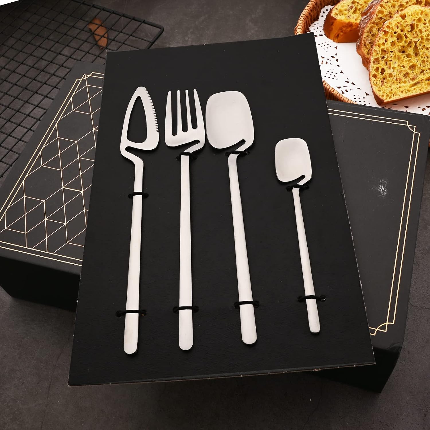 Creative Matte Silverware Set High quality Premium quality, the flatware set is crafted from quality 304 stainless steel, rust resistance, no metallic taste in your mouth after using, and will not bend or flimsy, durable and sturdy for long term usage. User friendly The unique design of our flatware allows for more secure placement on plates, bowls, and cups. No need to worry about your sauce-covered spoon or fettuccine-twirled fork falling onto the table with just a light bump Matte finish Modern silverware features a fancy looking with brushed stainless steel, sleek matte finish surface without rough angles, safe for daily usage. Elegant look would make good match with your existing dinnerware, simple line sense add modest luxury to your dining table. Nice gift The tableware set packaged in this gift box has binding ropes to fix the tableware to avoid falling. It has a delicate appearance and is very suitable for giving to friends or relatives.