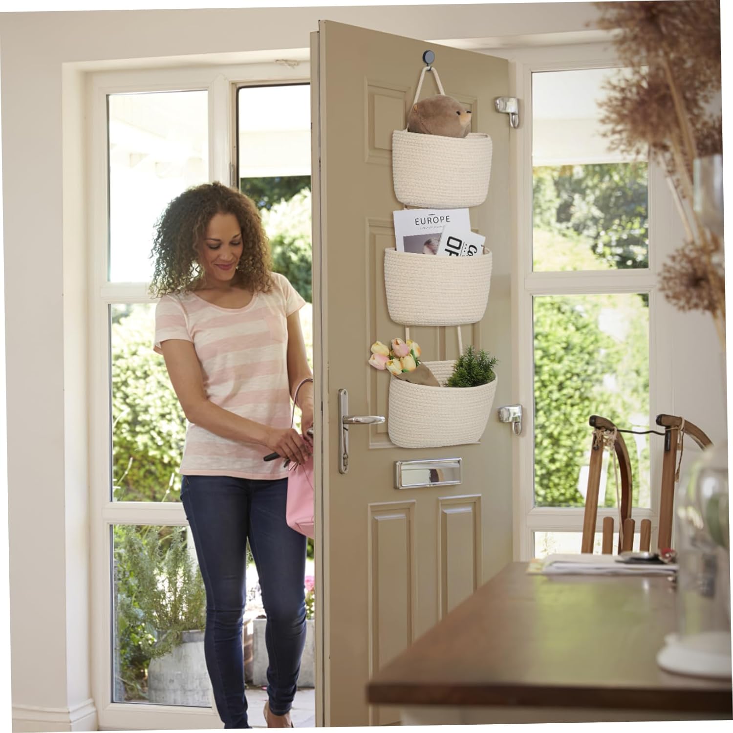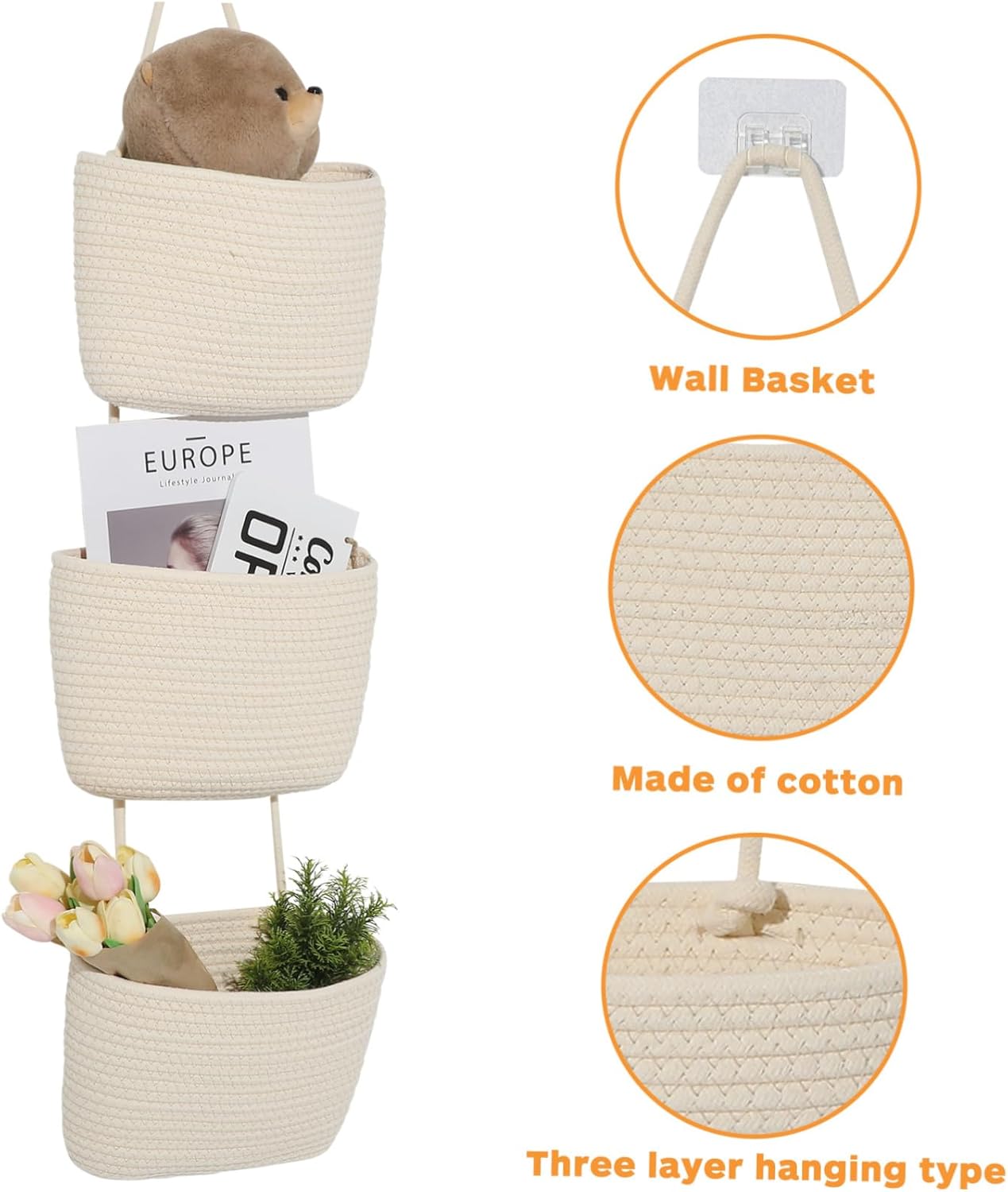 Package List 1 x Hanging Basket Features - Size: 108.00X30.00X20.00cm/42.44X11.79X7.86in Hanging Rope Baskets For Wall -Multi-purpose storage: This wall mount basket is for storing and organizing toiletries items in the kitchen, bathroom, bedroom, and more Over Door Hanging Organizer. -Stylish and modern: The wall basket in a solid color adds a touch of modern style to your room and gives it a well-organized look Stuffed Animal Storage Bin. -Efficient organization: With 3 layers, the wall hanging basket allows for efficient organization and easy access to items Fabric Storage Cubes. -Color:Beige Organizer Basket -Material:Cotton Over The Door Organizer -Sturdy and lasting: Crafted from sturdy cotton rope, the storage basket has been designed for durability and endurance in everyday use Wall Hanging Basket. -Maximizes space: By utilizing vertical space on the door, window or wall, the rope basket helps maximize storage capacity without taking up tabletop Mount Storage.Goods DescriptionStorage Bins Looking for a stylish and functional storage holder for your home? Look no further than our Hanging Rope Basket! This basket is constructed with cotton rope and features a sturdy frame, suitable for organizing towels, toiletries, or plants.Hanging Storage Basket It only requires a hanger hook.Cotton Rope Storage Basket The basket is easy to install