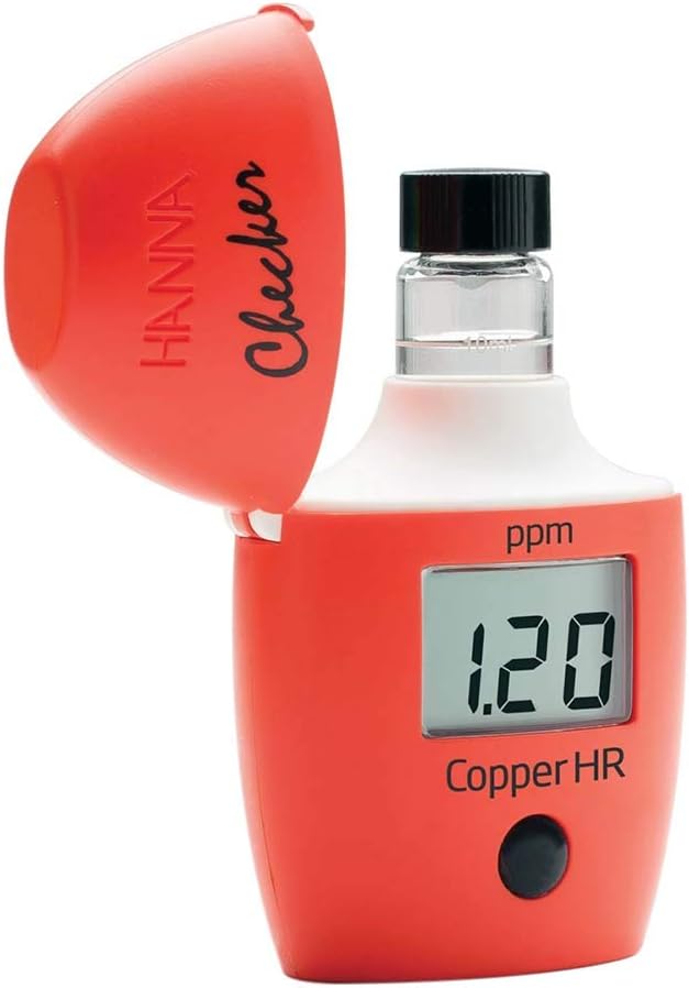 The Hanna Instruments Copper High Range Checker (HI702) is a simple, accurate, and cost effective way to measure high ranges of copper. Designed as a more accurate alternative to chemical test kits, the Hanna Instruments Copper High Range Checker provides quick, accurate results in a few easy steps. Features at-a-glance: Easier to use and more accurate than chemical test kits Dedicated to a single parameter Small size, big convenience Ideal for: Water quality, Environmental, Plating, Education Specifications: Range: 0.00 to 5.00 ppm Resolution: 0.01 ppm Accuracy @ 25°C/77°F: ±0.05 ppm ±5% of reading Light source: LED @ 575 nm Light Detector: Silicon photocell Method: Adaptation of the EPA method between copper and bicinchoninate Environment: 0 to 50°C (32 to 122°F); RH max 95% non-condensing Battery Type: (1) 1.5V AAA Auto-Off: After 10 minutes of use Dimensions: 3.2" x 2.4" x 1.5" (81.5 mm x 61 mm x 37.5 mm) Weight: 2.25 oz. (64 g) Includes: (2) cuvettes and caps (6) reagent packets (1) AAA battery Instruction manual 6 month warranty
