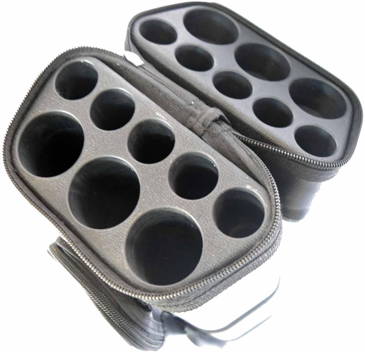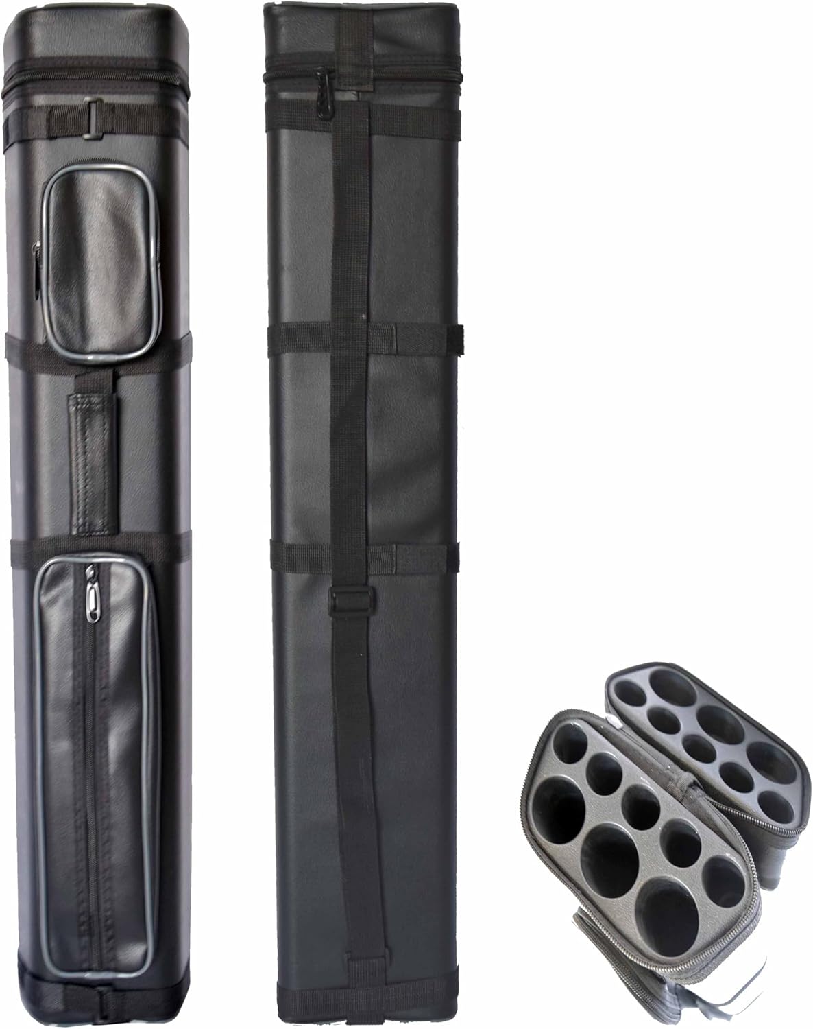 Vinyl covering Holds 2 butts and 4 shafts Adjustable shoulder strap Pocket to hold chalk, tips, etc. This item measures 32" in length X 5 1/2" X" 3 3/4" Small pocket measures 6" X 4" X 1 1/2" Large pocket measures 14" X 4" X 1 1/2" Divider tubes goes all the way into the case.