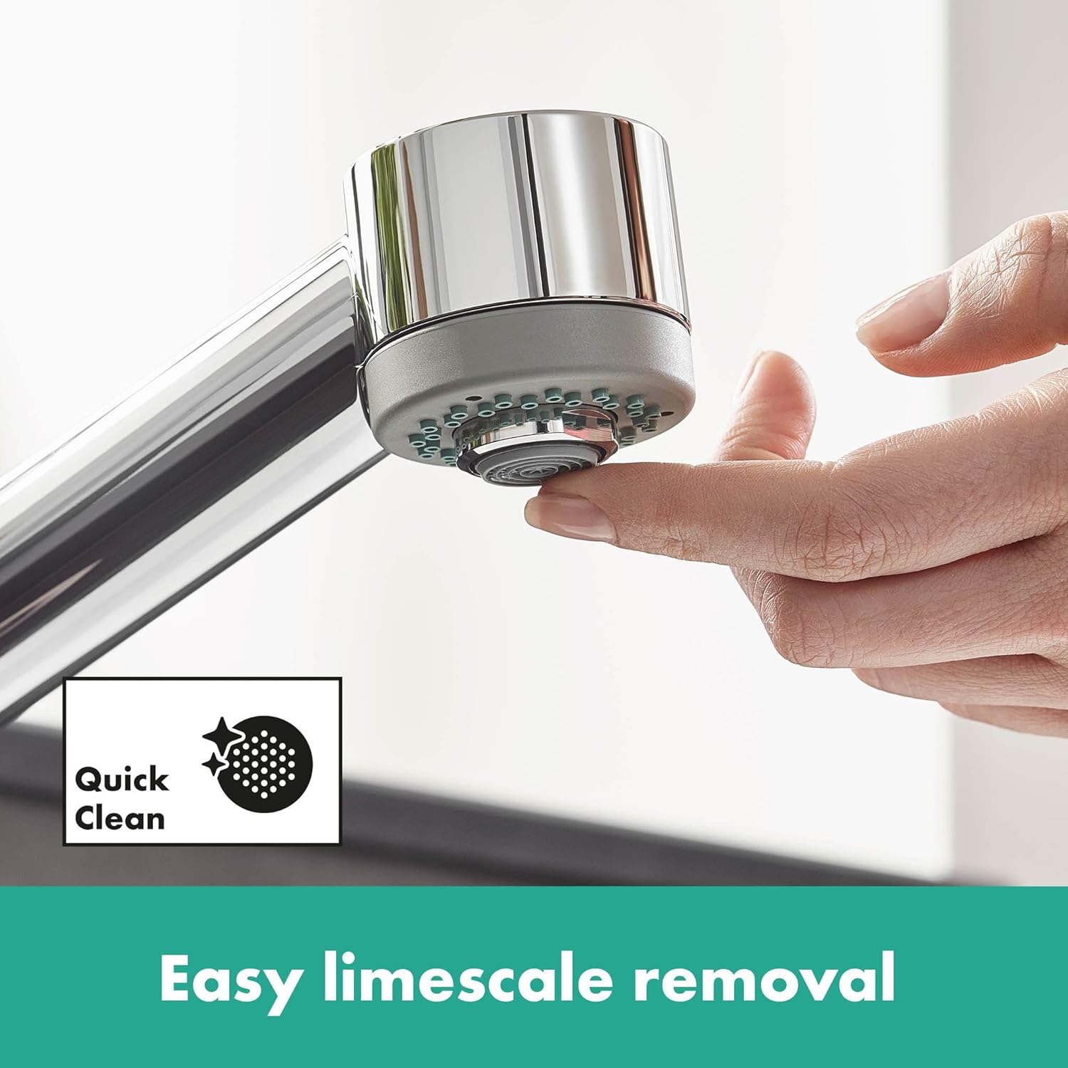 Looking for reliable help in the kitchen? Order a modern quality mixer for more freedom of movement at your sink!Enjoy comfort and freedom of movement when cooking and washing upWith a swivel range of 150°, this kitchen mixer offers plenty of freedom of movement at the sink. The easy-running 2-spray pull-out spray also increases the working range. The normal spray fills pots or bowls in an instance, while the generous shower spray is an ace when cleaning and rinsing. Functionality and form are cast from one aesthetic mould with Talis: the mixer is slender and fitted with a user-friendly pin handle. This plain design blends seamlessly with timelessly modern kitchens. In addition to the exemplary level of comfort when performing your daily kitchen tasks, the mixer also scores points for its sophisticated technology. The patented ceramic mixer system is made at the hansgrohe cartridge works in Germany's Black Forest – for smooth handling and an even water flow. The Boltic handle lock prevents the lever from wobbling – even after years. A temperature limit can be set to prevent the water from becoming too hot – ideal for children and the elderly. This kitchen mixer can also be used with continuous-flow water heaters.Velvety-soft water that splashes less.hansgrohe has developed a technology that generously mixes water with air (AirPower). This not only makes the waterflow from this mixer fuller and softer, but also reduces splashing.Hansgrohe becauseThe Hansgrohe company is based in Schiltach in Germany’s Black Forest and over the course of a company history lasting more than 115 years, has acquired a reputation in the bathroom and kitchen sector as an innovation leader for technology, design and sustainability. Hansgrohe fittings, showers and shower systems are originals, created to make your bathroom and kitchen more beautiful and user-friendly. The enjoyment of water – every day.