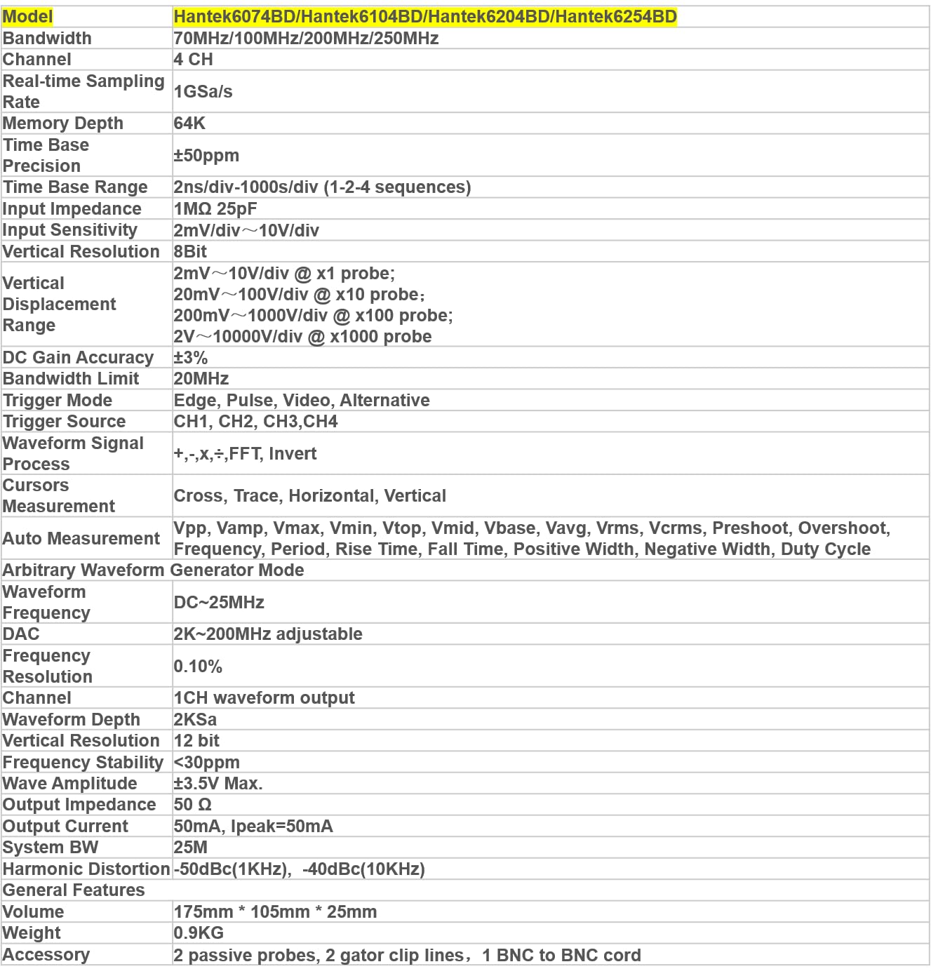 Qingdao Hantek6004BD Series* 4CH oscilloscope & function/Arb. waveform generator. * The performance of this model could even better than the performance of benchtop oscilloscope. * Function/Arbitrary Waveform Generator: 200MSa/s DDS, 12bits of vertical resolution, built-in variety of standard * Pass/fail test, resourceful trigger function, dynamic cursor tracking, waveform record and replay function. * USB2.0 Interface, plug and play device. * Good mechanical design with small size which is easy for carrying. The outer case is made by the same material with - Anodised aluminium. * Fit for the portable computers, table PC, and repairing/fixing of production line. Suitable for business trip use. * Software support: Windows10, Windows 8, Windows 7* The waveform data could be output to EXCEL,BMP,JPG as time and voltage category. * More than 20 kinds of automatic measurement function, PASS/FAIL Check function, fit for engineering application. * Serial bus triggering and decode, Bus protocol information can be quickly and intuitively displayed in table form. * Waveform averaging, afterglow, lightness control, reverse, add, subtract, multiply, divide, X-Y display. * FFT spectrum analyzer* One computer could connect with multiple oscilloscopes, expand the channel number easily. * Provide secondary development library DLL; Provide Labview\VB\VC developing examples. *