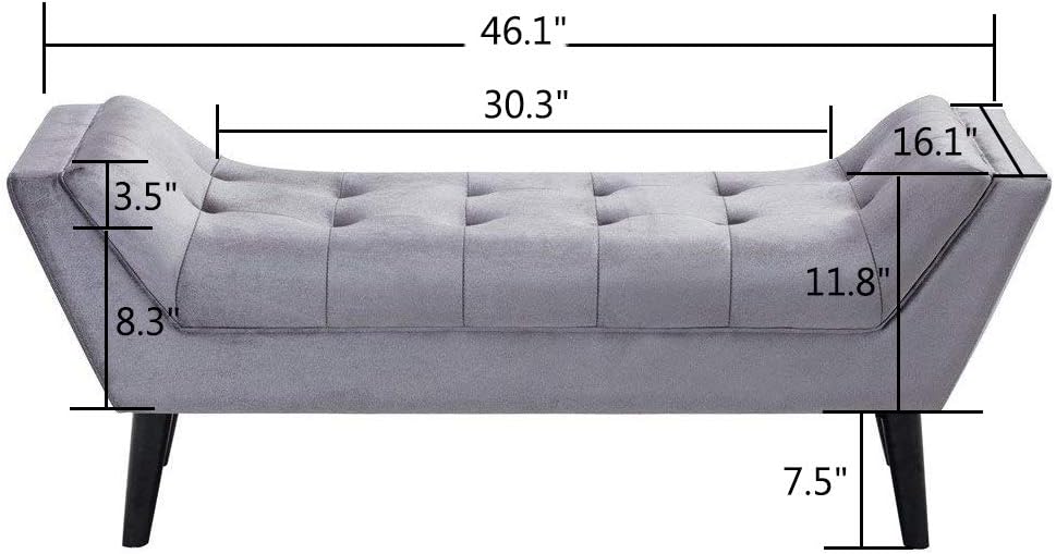 Product Specifications: *Color: As shown in the figure (due to differences in computer resolution, there may be some color difference) * Easy assembled With small tools, it is easy for assemble. * Bench size: 46.1"L X 16.1"W X 19.3"H *Sit back in this comfortably smooth arm chair. High quality velevt fabric offer a comfortable seating. *Contemporary design with wooden frame and button tufted upholstered, pop color.With wood legs, this bed bench offers a morden and accent tone for your home. *Use it in the bedroom as a place to sit and take off your shoes at the entrance, or as an ottoman in the family room. *This is a good choice, looks beautiful in your home and will bring you years of enjoyment. * Multi-functional design and light wooden legs. Add more storage and functionality to any room, and the decorative look matches your interior and furnishings. Durability: * The elegance of the wooden feet feels comfortable and warm, and its durable construction ensures that the footrests are in your home for a long time. Design: *The ottoman bench is the perfect complement to any room that requires a footstool that can double as a comfortable seat. Soft and stylish, this ottoman offers the best of both worlds, allowing you to relax and make your guests feel comfortable. Comfort: *The thick cushion allows you to sit or rest, while the sturdy base provides greater stability. Package content: 1 x Ottoman Bench