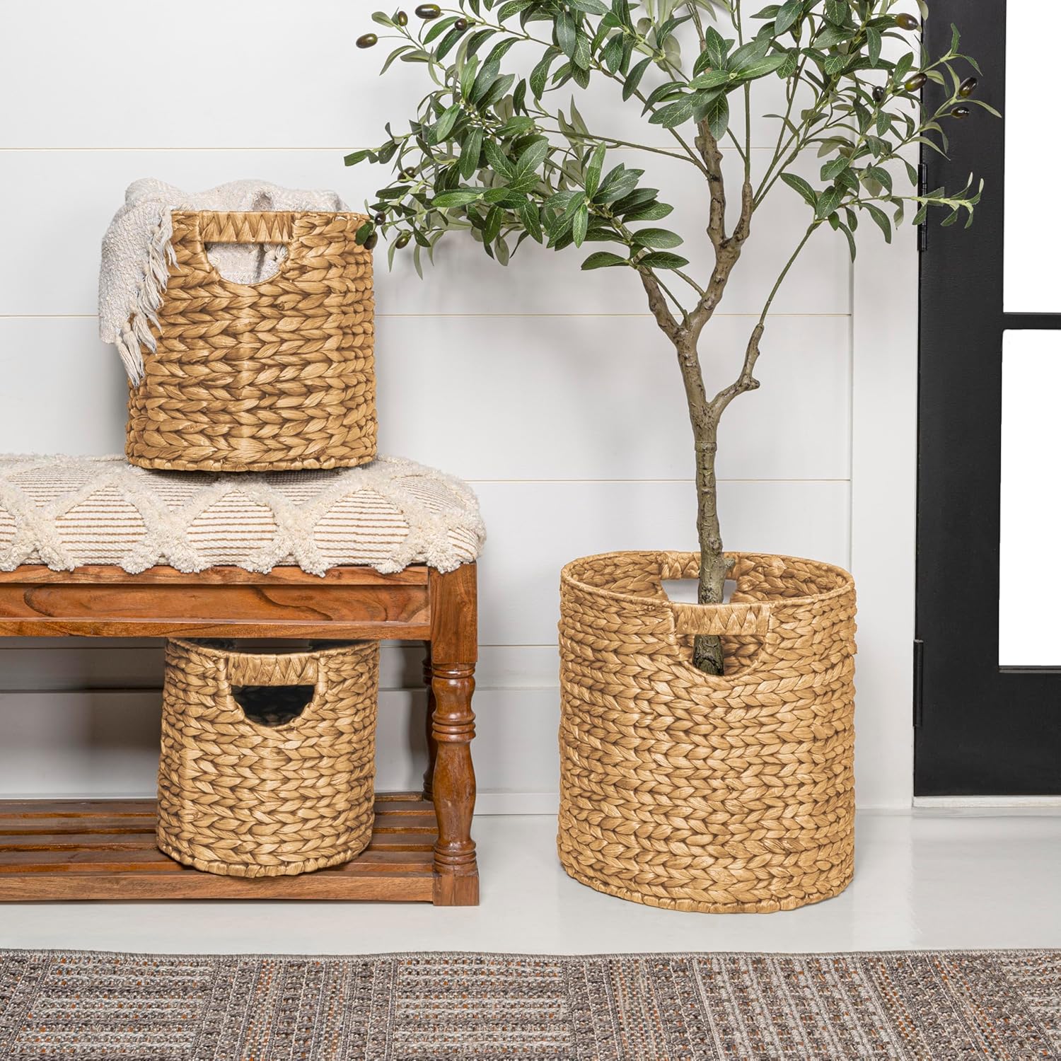 Organize your living room, bedroom, bathroom or nursery in classic Bohemian style with our set of three cylinder storage baskets. They're hand-woven from natural hyacinth fibers; half-circle handles create a cottage look. Use these handy nesting baskets for toys and books, or organize the changing table, crafts or pantry supplies.