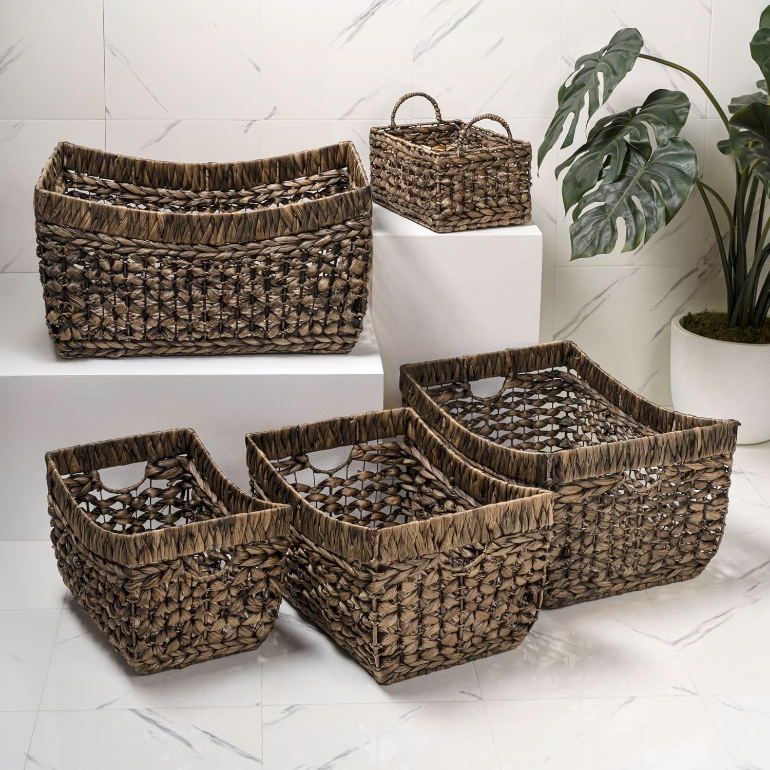 This five-piece basket set blends the natural texture of handwoven water hyacinth with the stability of a reinforced metal frame. Open-weave construction adds an airy look while keeping contents visible and accessible. Designed for versatile use, these baskets offer both stylish organization and durable function throughout the home.