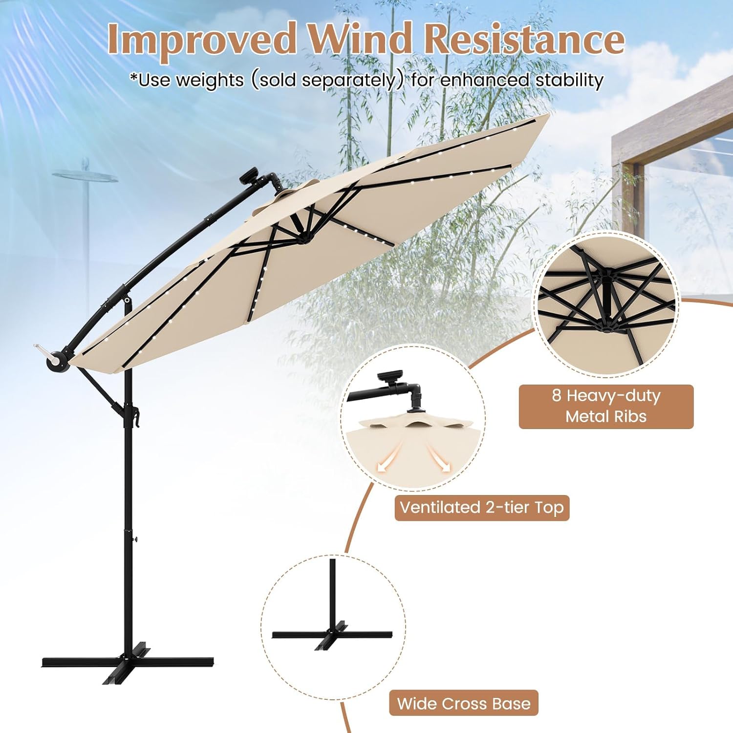 Description: Create your dream oasis with the ultimate solar-powered patio umbrella! Experience the magic of 40 brilliant lights illuminating your evening parties. Say goodbye to extra energy bills with the solar charging system - saving you money and the environment. As for day time, the 10 ft offset canopy made from premium fade-resistant fabrics, can unleash the maximum sun protection and guard you against drizzles and sun rays. Effortlessly set up and adjust the umbrella to your liking with the flexible adjustment mechanism - customize the height and angle to perfection. What's more, the sturdy metal construction with wide cross base ensures reliable support and can be reinforced with weights (not included) for unmatched stability. Enhance your patio or garden and experience ultimate relaxation or host unforgettable gatherings with this exquisite cantilever umbrella. Elevate your outdoor space today! Features: Adjustable canopy provides ideal sunshade for daytime activities Also offers energy-saving illumination for evening gatherings 40 solar lights can last 7 hours once fully charged Simple crank handle for opening or closing the umbrella With tilt angle adjustment and height adjustment for maximum sunshade Ventilated 2-tier top reduces pressure on canopy for better resistance against wind Heavy-duty metal frame with 8 ribs and cross base ensures stability and reliability Premium fabric makes for a drizzle-proof, sun-protection and fade-resistant canopy Specification: Color: Beige/ Brown/Orange/Red Material: Metal, Polyester Umbrella Diameter: 10 ft/300 cm Overall Height: 8.2 ft/250 cm Base Dimensions: 39" x 39"/99 x 99 cm (L x W) Net Weight: 30 lbs/13.5 kg Note: You can use weights (sold separately) for enhanced stability. Package Includes: 1 x Offset Hanging Umbrella 1 x Instruction