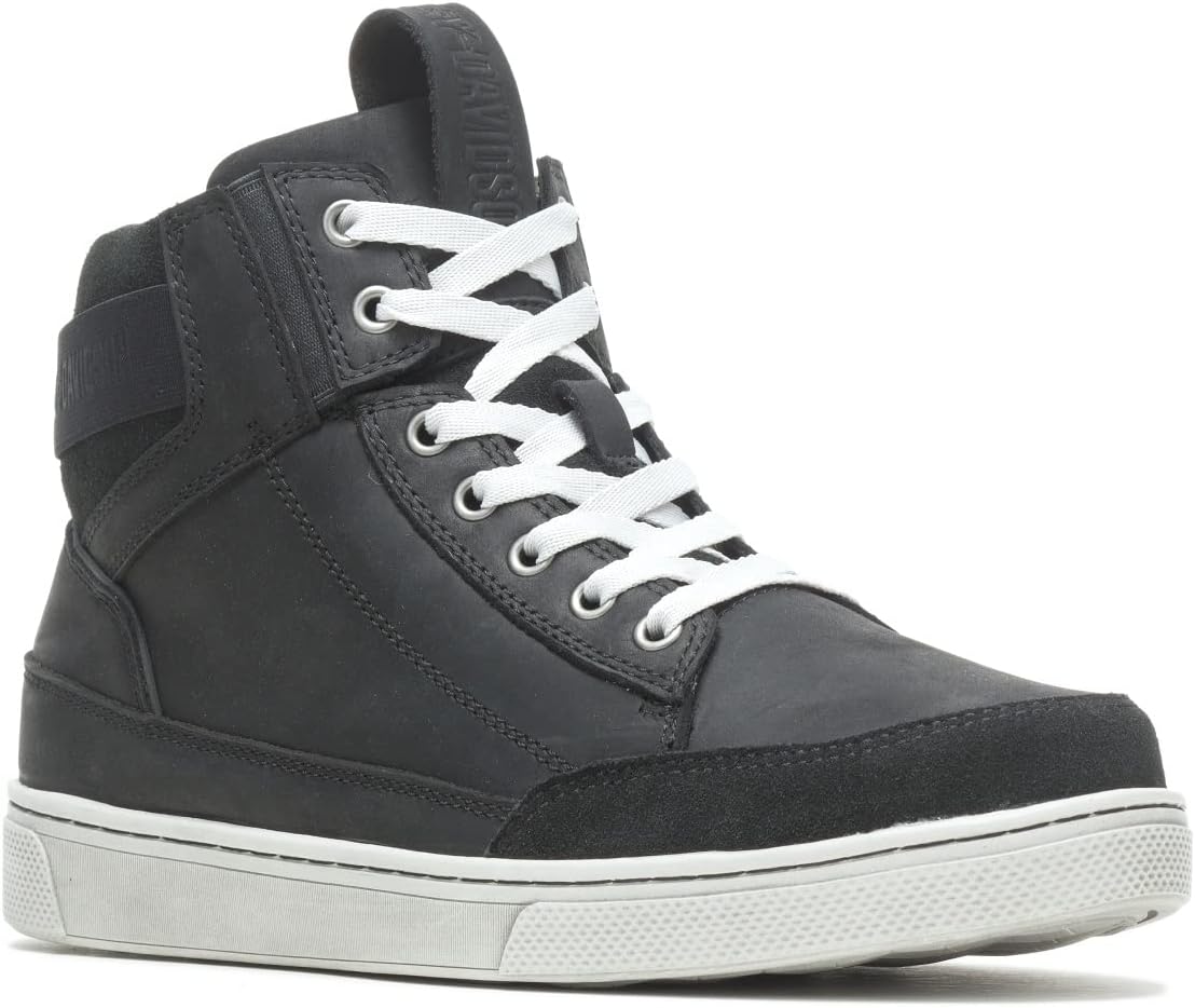 Harley-Davidson Men's Bauman Riding Appropriate* Black or Grey 4.25-Inch Reflective, Waterproof Motorcycle Sneaker Boots, Black-D50002, Grey-D50003. Kick start your ride with The Bauman waterproof full-grain leather sneaker with suede accents - featuring Poron ankle protection, 3M reflective piping for added visibility, and a breathable Hydro-Guard waterproof membrane for the lining. Bound onto one of our number one selling oil & slip resistant rubber outsoles, these boots keep you safe while giving you the urban style you crave. This sneaker boot has it all: Poron ankle protection absorbs more than 90% of energy when impacted a high strain rates; 3M reflective material to improve the chances of being seen in low visibility conditions; and, a Hydro-Guard waterproof membrane to keep your feet dry and ride-ready in all weather conditions. Lace up with contrasting white laces. A logo tongue pull-on strap assists in donning. Another logo supporting strap wraps and secures the ankle with a snug fit. The tongue is padded, as well as the Hydro-Guard lining. The outsole color matches the laces, and the street-side has a classic Harley orange Bar & Shield logo at the instep. The boot's sole, insole and upper are bound using cement construction processes, a time honored and durable method that allows for a flexible and easy stride. Uptown, downtown, in wet or dry conditions, these sneakers will get you there in style and comfort. Shaft height: 4.25", Heel height: 1". Sizes US: M 7-12, 13. Manufacturer Part Number, Black-D50002, Grey-D50003. *Riding Appropriate – Abrasion, slip, and oil-resistant boots, ideal for riding motorcycles.