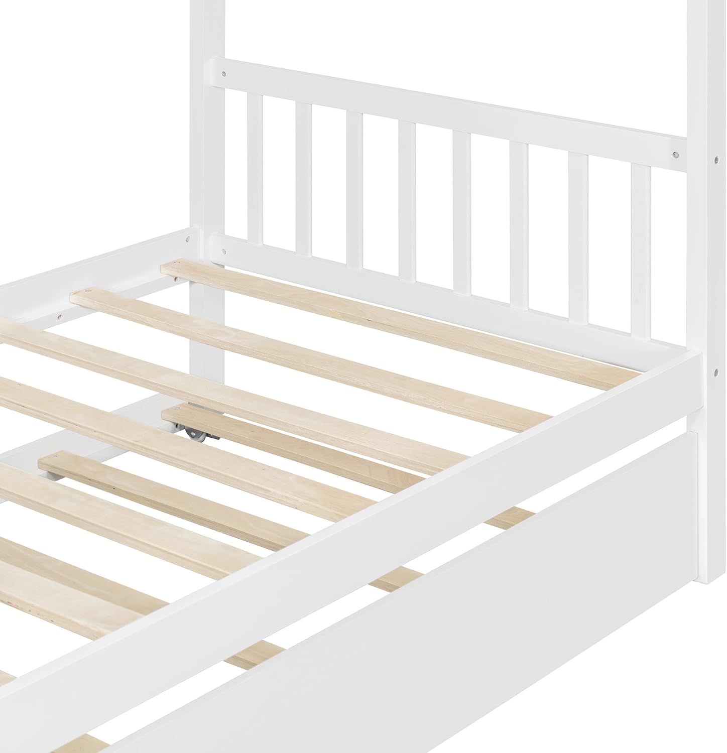 The unique house-shaped design of this bed adds an extra element of fun to your room. It creates a cozy and private space that can be decorated and personalized. Product Name: Twin Size Wooden House Bed Overall Product Dimension: Bed:80.5''L x 41.5'' W x 62.8'' H Number of Package: 1 Overall Product Weight: 82.89 LBS Weight Capacity: Bed:400 LBS Trundle:400LBS Recommended age: 6+ Recommended Mattress Thickness: Bed:6-8" Trundle:4-6" Size: Twin/Twin Color: White/Gray/Natural/Walnut Material: Pinewood+Plywood Box Spring Required: No Number of Slats: 10+7 Country of Origin: Vietnam Notes: Manual measurement has been used,there may be some reasonable error. All the pictures are taken by actual samples, slight.