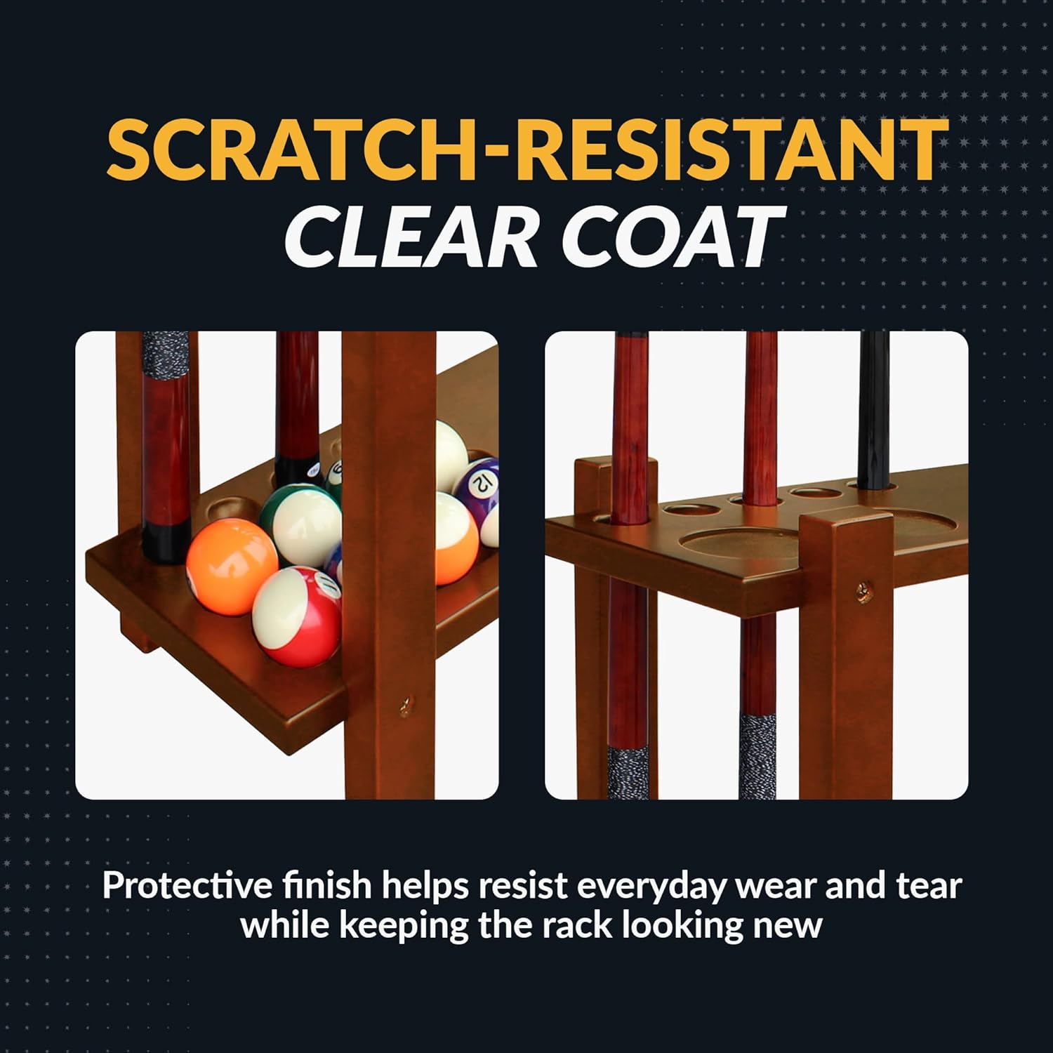 Keep your billiard playing accessories organized and close to the table. The Classic floor free standing billiard accessory storage rack features convenient built-in drink holders. Excellent storage for up to ten cues, chalk, table brush and a full set of billiard balls. A perfect solution for all of your billiard storage needs. Available in Antique Walnut or Rich Mahogany finish 180-day Limited Warranty.