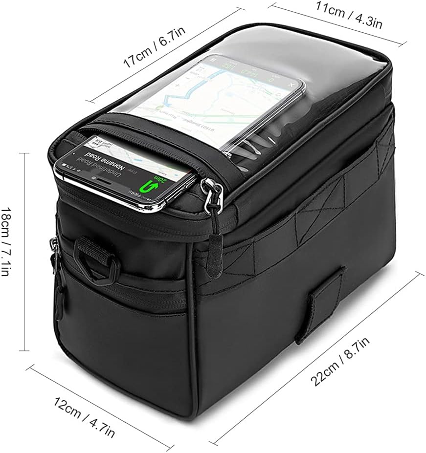 Features:The transparent pocket of the smartphone makes it easy to use the phone as a map.Waterproof and tear-resistant material, effectively light rain or splashing water.The large main pocket with zip closure for easy access to items.The adjustable shoulder strap is tightly fixed to the bicycle frame, suitable for most types of bicycles.Multifunctional design, equipped with detachable reinforced shoulder strap.High compatibility, wide application range, suitable for 4.5-6.5 inch mobile phones.Excellent accessories for bicycles, allowing you to enjoy the fun of riding a bicycle.specification:Material: PVCColour: Black Size: 22*18*12cm/8.7*7.1*4.7inWeight: 260g/9.2ozpacking list:1 * Bicycle bagnotes:1. Manual measurement, please allow 1~3mm error, thank you.2. Due to the difference of different monitors, the picture may not reflect the actual color of the project. We that the is the same as the picture.Suitable for a beautiful storage bag for road bikes.