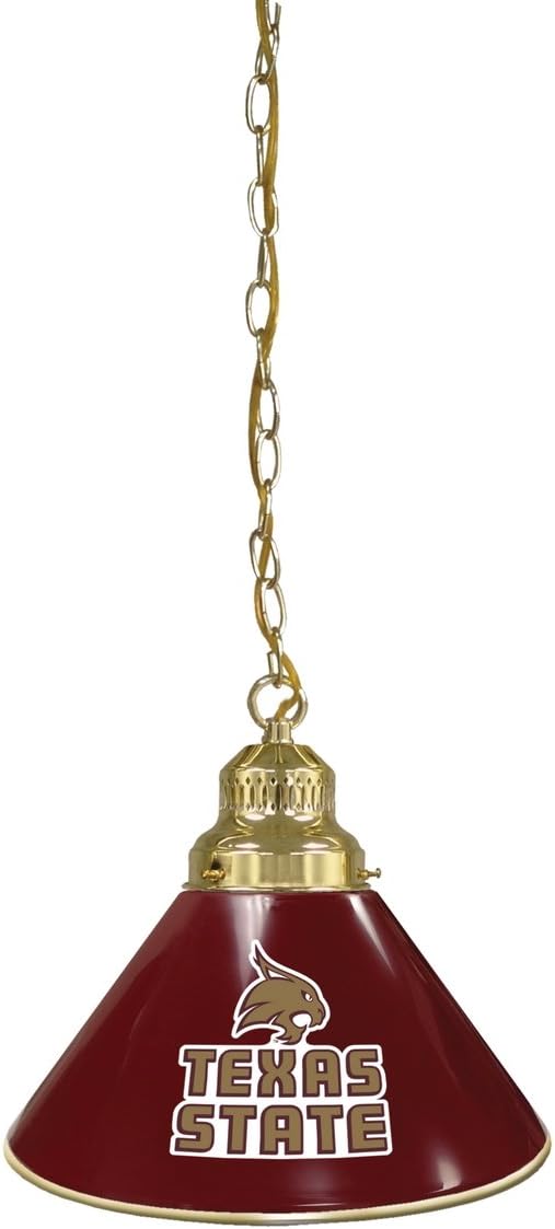 This Single Shade Texas State University Pendant Light by Holland Bar Stool will certainly brighten up your space. Whether above your pool table, game table, bar, or wherever you need extra light, this classic is sure to impress. Included is 4’ of chain for hanging, ceiling mounting fixture, and 5’ of cord with a 3-pronged polarized plug. Light fixture is vented to allow heat to escape instead of building around the socket, prolonging bulb life. Decorative molding accent trim on shade rim to match fixture. Lights are UL approved. Brighten up your game room with a classic billiard light from Holland Bar Stool Co.
