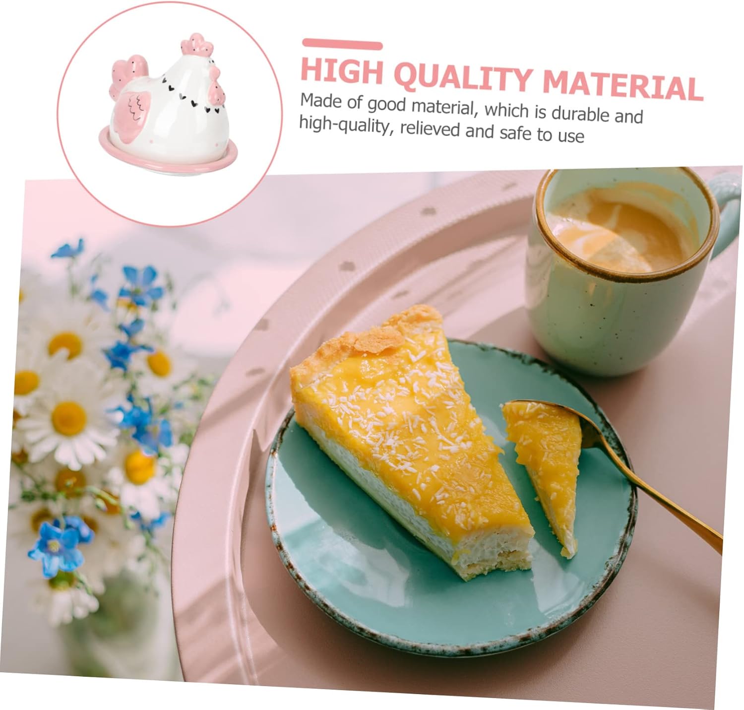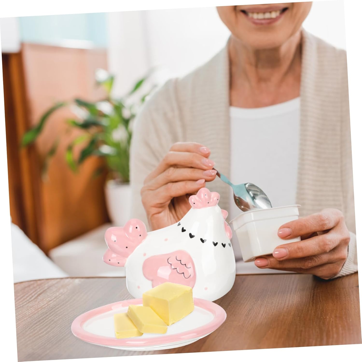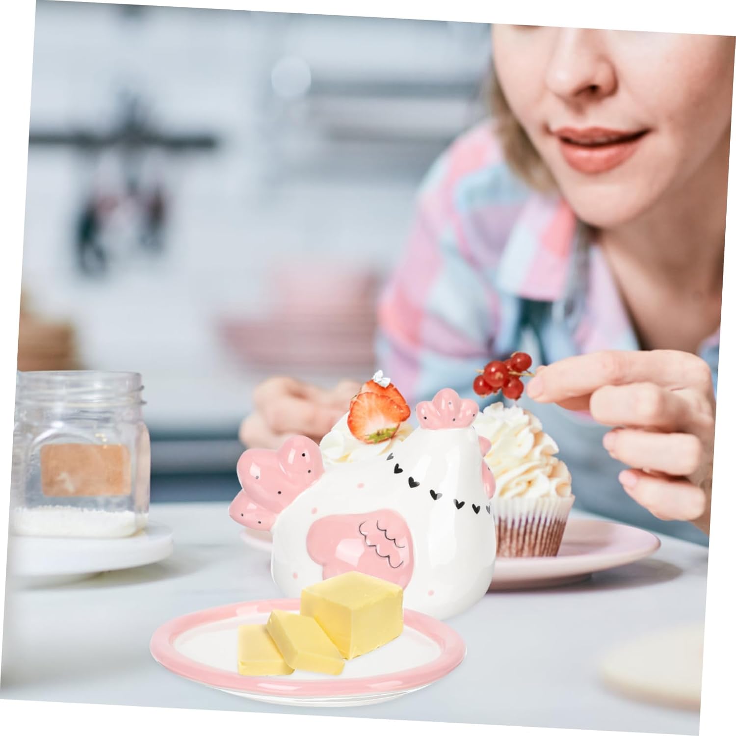 Package List 1 x Butter Box Features -Color: As Shown Embossed -Product Info:Ceramic storage box -Size: 18.00X15.00X15.00cm/7.07X5.89X5.89in butter keeper chicken -Material: Ceramic butter crock container -Suitable for restaurant, dessert shop, kitchen, use it yourself, or present it to your friends as a gift butter containers. -Armed with a cover, good airtightness, more convenient to storage, and keep food fresh butter tray. -Adorable cartoon chick shaped design, delicate and lovely, which can be an ornament for kitchen butter dish cute. -It has a smooth surface, , , and it's easy to clean, making your life convenient Adorable . -Made of good material, which is and , relieved and to use butter container for fridge.Goods DescriptionChick The lovely chick shape appearance makes it a decoration for your kitchen.butter keeper chicken Made of which is sturdy and .unique butter dish Smooth edge, no burrs, workmanship, thick and in use.butter keeper with chicken This is a convenient and practical butter plate for home or restaurant.Adorable A practical storage plate for butter, cheese, dessert, bread and so on