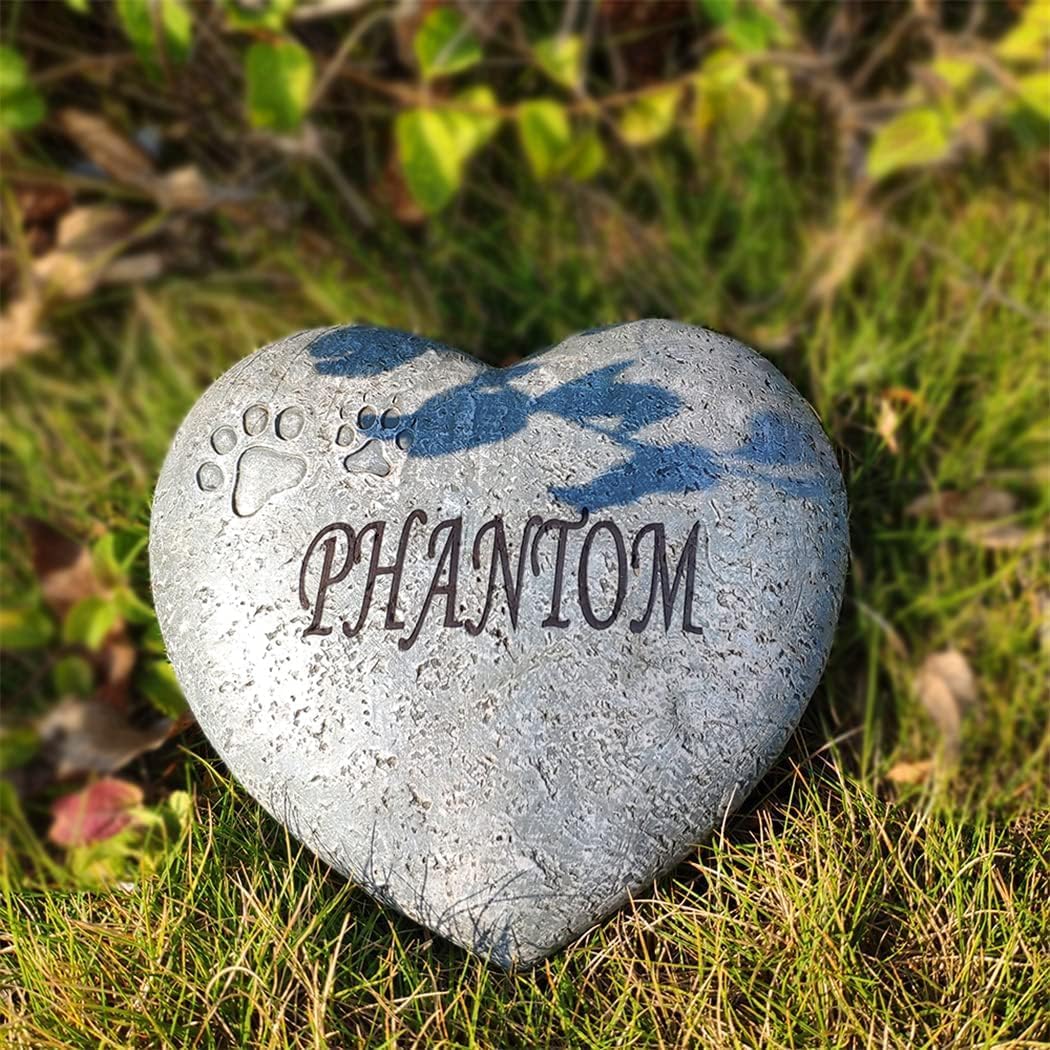 A surprising pet dog loss memorial gift: Express your sincere emotions the pet memorial stone is a perfect pet memorial gift to express sympathy comfort remembrance healing. This beautiful pet dog memorial stone helps a sad friend or loved one remember their special furry friend. 1. Perfect design: This dog memorial stone has paw on the heart shaped appearance looks ver cute perfect for small dogs memorial stones keeps you and your pet together in spirit forever. 2. Customized including pet's name and born passed dates both optional. Laser engraved and then hand paint it with water-resistant paint will last forever. 3. Material: Made of high quality poly resin sun-resistant and waterproof hard to be damaged resistant to all weathers and seasons. 4. Well-packed protected with special materials there is absolutely no need to worry about damage during transportation nice pet memorial gift choice for a griewing pet owner. NOTE: Please reconfirm the personalization information before placing the order.