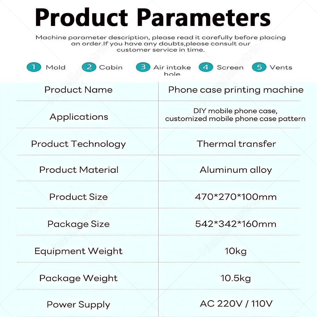Compatible with all phone cases,struggling to unleash your creativity?Single layer and double layer molds are ready for you!Hot press,phone case heat transfer machine,fast transfer,3D effect,strong heat dissipation,compatible with all phone cases.▶Specifications:Product Name: Vacuum Sublimation Transfer MachineApplication: Making phone cases,custom designsProcess: Heat transferMaterial: Aluminum alloyProduct Dimensions: 47 x 27 x 10 cm / 18.5 x 10.6 x 3.9 inchesPackaging Dimensions: 54.2 x 34.2 x 16 cm / 21.3 x 13.5 x 6.3 inchesProduct Weight: 10 kg / 22 lbsPackaging Weight: 13.4 kg / 29.5 lbs▶Package List:1 x Hot Press1 x Single layer Mold1 x Double layer Mold20 x Double layer HD Phone Cases▶Customer Service:Please contact us by email if you have any questions.We will provide you with the best service within 24 hours!