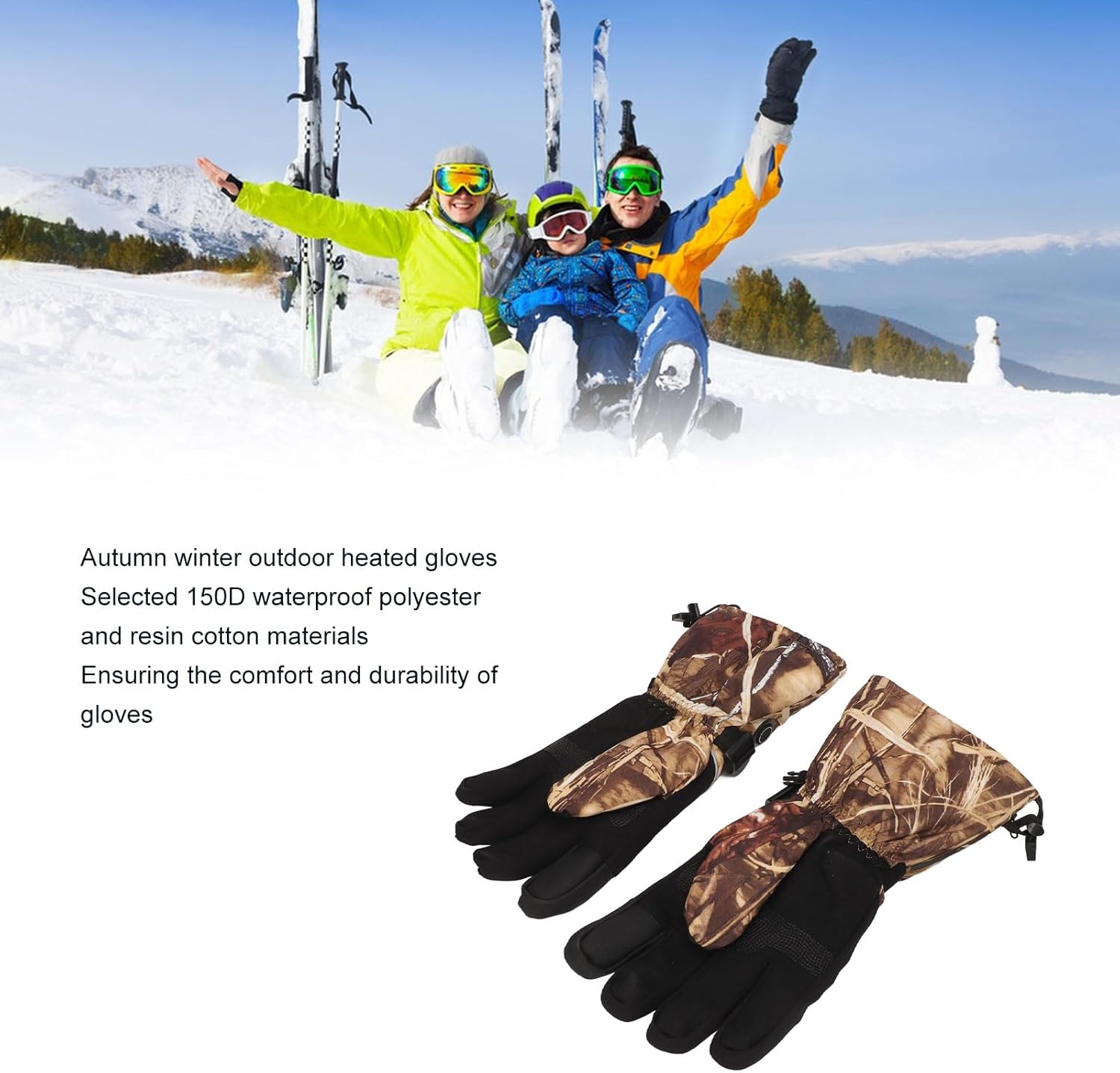 Heated Gloves, Rechargeable Battery Powered, Touch Screen Compatible, 150D Polyester with Cotton Lining, for Outdoor Fishing Skiing Hunting, Camo PatternItem Type: Heated GlovesProduct Material: 150D Waterproof Polyester, Resin CottonProduct Color: Old Reed CamoWeight: Approx. 346g / 12.2ozBattery: Each Battery Box Requires 4 AA Batteries (shipped without batteries)Package ListA Pair Gloves2 x Battery Box