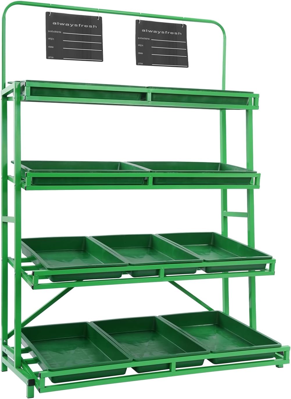 DescriptionThis four-tier supermarket retail storage rack with ten baskets features a simple yet practical design that complements any decor. Sturdy and reliable, it's ideal for displaying various merchandise, enhancing your store's image, and catching customers' attention—making it an ideal partner for your business!ApplicationIt can be used to display and sell fruits, vegetables, snacks, and other small daily necessities, suitable for kitchens, supermarkets, fruit shops, and other locations.SpecificationMount Type: Floor StandAssembly Required: YesStyle: ModernColor: BlackMaterial: Iron, RubberProcess: High-temperature Spray-coatedNumber of Tiers: 4Number of Baskets: 10 Overall Load-capacity: 100kg/220.46lbsRack Size: 120*60*170cm / 47.2*23.6*66.9inGY8HI6-012600Package Size: 131*54*14cm/52*21*5.5inGross Weight: 9.1kg/20lbsNet Weight: 8.64kg/19lbsGY8HI6-012300Package Size: 58*37*14cm/23*15*5.5inGross Weight: 3.9kg/8.6 lbsNet Weight: 3.71kg/8.2lbsPackage Included1* Supermarket Retail Storage Rack10* Baskets4* Hooks2* Hanging Product Labels28* Protective CoversOther Accessories