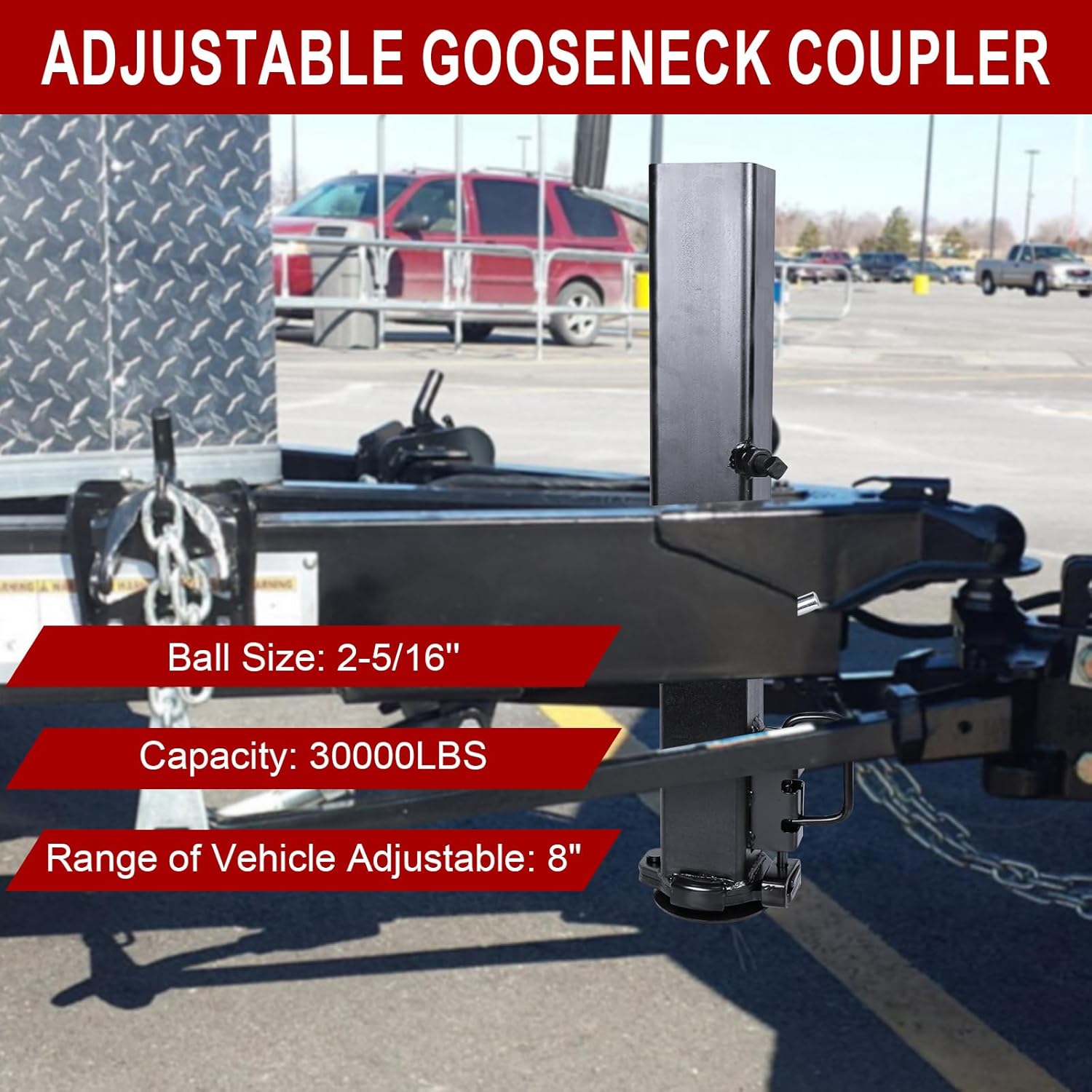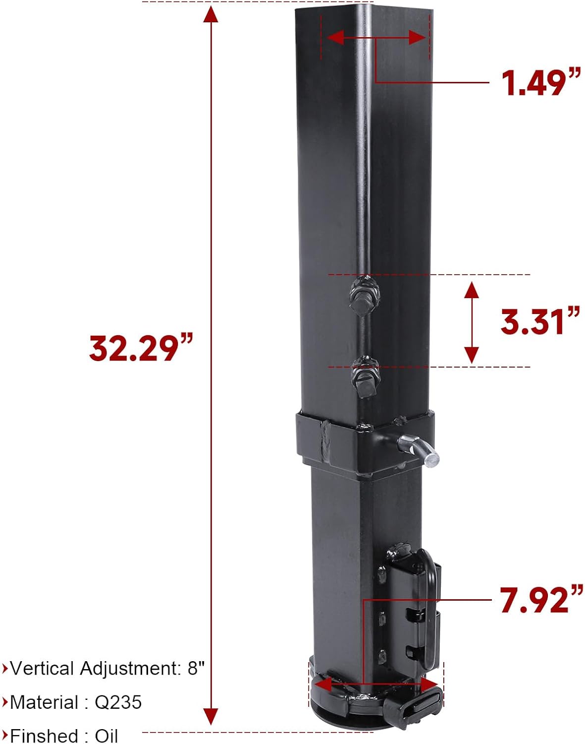 Ball size: 2-5/16" Range of vertical adjustment: 8" Height:Retracted: 32" Extended: 40" Outer tube diameter: 4-1/2" Inner tube diameter: 4"Inner tube wall thickness: 0.24" Hole spacing: 2-11/16" from center of hole to center of holeHole diameter: 7/8" Weight capacity: 30,000 lbs