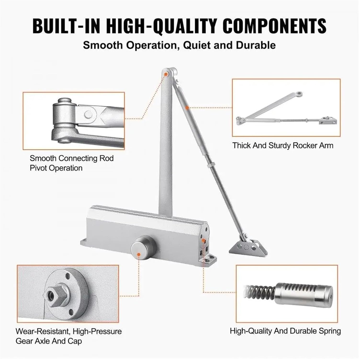 Gate HardwareDoor Opening Angle: 115°Model: D4016Load Bearing: 330 lbs / 150 kgHydraulic Buffer Valves Functionality: Latch, Sweep, Backcheck Control ValveProduct Dimensions: 9.96 x 3.27 x 2.91 inch / 253 x 83 x 74 mmNet Weight: 5.38 lbs / 2.44 kgMain Material: Cast AluminumColour: SilverHign-concerned Chemical : Material : Stainless steel