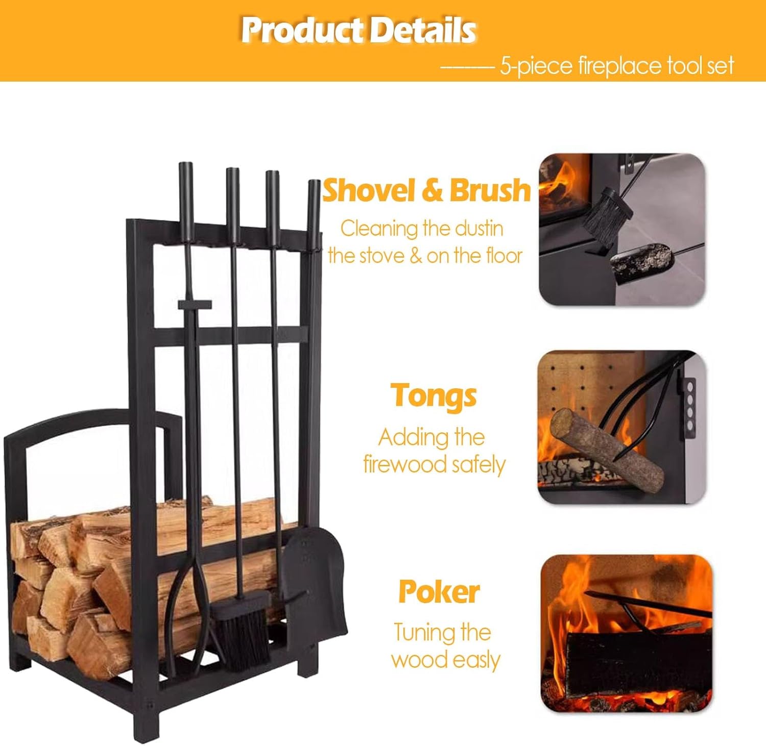 It coordinates with most fire screens, log holders and racks, or outdoor fire pit tools; robust design is stylish for both modern home decoration and country fireplaces. The fireplace tongs help to safely place kindling and reposition logs while the fireplace brush features strong bristles to easily sweep ash and debris, conveying heat in a slow speed and avoid of burning fingers.▲Specification:- Item Name: Fireplace tools set- Material Used: Powder coated iron frame- Colour: Black- Size: 40x35x68cm(15.7x13.8x26.8in)- Load Capacity: 100kg/220lbs●Package Included: Fireplace tools rack ×1brush × 1shovel × 1tong × 1poker × 1 ▲Features --Stylish contemporary design--easy to set up--Large capacity --indoor or outdoor use▲NOTE: 1. Clean with mild soap and water while the screen is cooled. 2. Due to manual measurement, there may be a difference of 1-2cm.3. The reason computer resolution, there may be differences in color to the actual goods received prevail