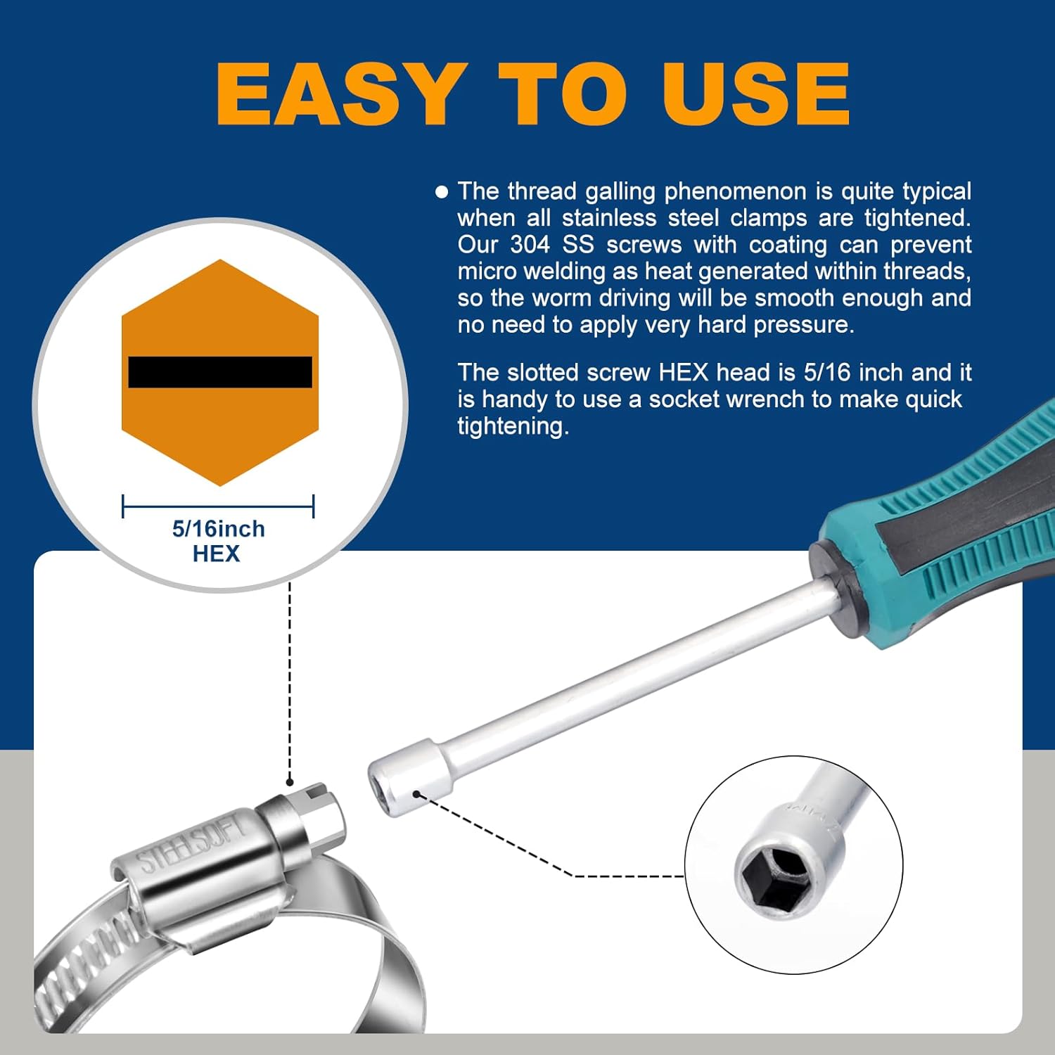 STEELSOFT 14 PCS worm clamp assortment kit are made of all 304 stainless steel to provide dependable and long lasting use.These non-perforated band hose clamps are based on the popular general purpose worm gear hose clamps, but engineered to prevent hose damage during using.The embossed band with rolled-up edge design is perfect for silicone, PVC or rubber soft hoses, protecting them from extruding or shearing.The free torque of our worm drive hose clamps are designed in a neutral level so that the tension can be maintained after initial installation.The welded one-piece housing is much stronger than other embedded buckle structure which is easily stripping out.7 sizes stainless hose clamps assortment include:2 pcs 5/16 to 1/2 inch, 3/8"(9mm) band width, mini size#42 pcs 3/8 to 5/8 inch, 3/8"(9mm) band width, micro size#42 pcs 1/2 to 3/4 inch, 3/8"(9mm) band width, size#62 pcs 5/8 to 1-1/16 inch, 1/2"(12mm) band width, size#102 pcs 1 to 1-5/8 inch, 1/2"(12mm) band width, size#162 pcs 1-1/4 to 2 inch, 1/2"(12mm) band width, size#242 pcs 2 to 2-3/4 inch, 1/2"(12mm) band width, size#36Total Quantity: 14 PCSBand Thickness: 0.024"Material: All 304 stainless steel(including screw)Neutral Salt Spray Test: 100 hoursScrew Hex Size: All 5/16"Failure Torque: 60 lb-inRecommended Installation Torque: 30-35 lb-inService Temperature: -22℉ to +338℉