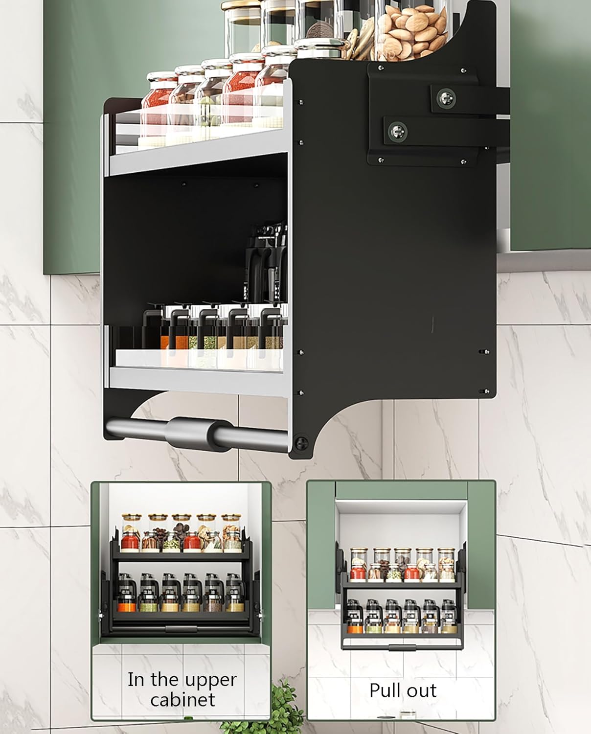 Pull-down shelves can be used in kitchen cabinets to help you better organize kitchen items, and pull-out shelves can make life more efficient. Smooth Pulling: The advanced pneumatic damping system with strong tension springs ensures easy pull-down and stable push-back. The foam non-slip handle provides you with a comfortable grip, ensuring that this shelf can be easily pulled down without slipping. Raised guardrail: Raised guardrail is convenient for taking and placing, preventing items from falling. Specifications: Material: aluminum and tempered glass Color: black Suitable cabinet interior height: 21.7 inches (55 cm) Suitable cabinet interior depth: 11 inches (28 cm) Suitable cabinet interior width: 14.2 inches - 15.8 inches (36-40 cm), 18.1 inches - 19.7 inches (46-50 cm), 22.1 inches - 23.6 inches (56-60 cm), 26" - 27.6" (66-70 cm), 29.9" - 31.5" (76-80 cm), 33.9" - 35.4" (86-90 cm) Product size: 14.2"x10.2"x21.3", 18.1"x10.2"x21.3", 22.1"x10.2"x21.3", 26"x10.2"x21.3", 29.9"x10.2"x21.3", 33.9"x10.2"x21.3" Maximum load: 20 kg/44lbs Notes: 1. Make sure your cabinet size is right before purchasing 2. Do not control the button while the basket is moving. Please control the button after it returns to the cabinet 3. Do not use hard tools to clean the shelf, which may scratch the surface of the product and affect its appearance. 4. Due to shooting light and manual measurement, there may be 1-3 cm error, please allow slight color difference and make sure you do not mind before ordering.
