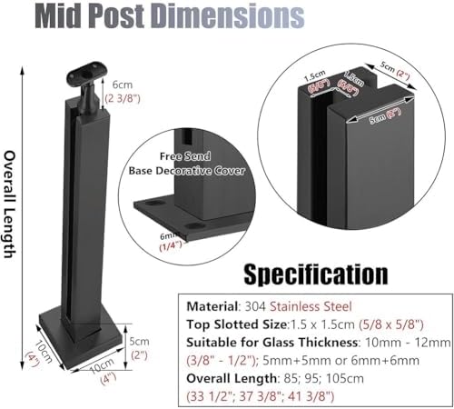 Elevate your outdoor and indoor spaces with our premium Glass Railing Post, designed for effortless installation and a sleek, modern aesthetic. Ideal for deck railing projects, balconies, patios, and pool areas, this product not only enhances safety but also preserves your unobstructed views. Made from durable 304 stainless steel, our railing posts are sturdy and reliable, providing an elegant solution for your architectural needs. The easy installation process allows you to mount glass, wood, PVC, or metal panels without the hassle of drilling into the glass. Simply slide the glass into the post slot, and it will be securely held in place. This makes it perfect for DIY enthusiasts and homeowners looking to enhance their living spaces without professional help. Our Glass Railing Post is versatile, making it suitable for various applications, including balcony guardrails, attic guardrails, staircases, and more. The design supports glass thicknesses of 1cm to 1.2cm, accommodating different styles and preferences. Please note that our 304 stainless steel is not recommended for areas within 10 miles of the seaside or saltwater to ensure longevity. For optimal stability, it is advised that the span between two structural posts does not exceed 4 feet (120cm). Specifications: - Product Name: Glass Railing Post - Material: 304 Stainless Steel - Color: Black - Wall Tube Thickness: 1.2mm - Base Thickness: 6mm - Top Slotted Size: 1.5 × 1.5 cm - Height Options: 85cm, 95cm, 105cm Package Includes: - 1 x Glass Railing Post - 1 x Square Base Cover - Mounting Accessories Transform your space with our Glass Railing Post, combining style, safety, and ease of use for all your railing needs. If you have any questions or require assistance, please feel free to reach out to us.