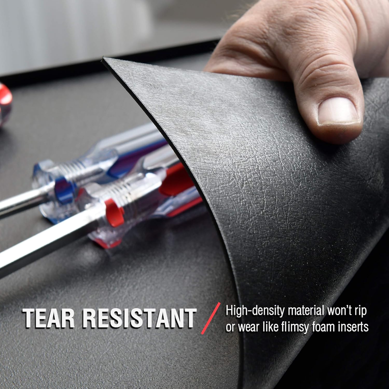 Protect your tools and tool boxes with ToolTex heavy-duty drawer liners. No more rattling, shifting, clinking, or crinkling in your tool chest and toolbox drawers. The flexible thermoplastic drawer liner won't shift or wrinkle and will grip your tools to keep them from moving, protect them from damage caused by slamming drawers, and keep them in place so your tool box and roller carts stay organized. The non-adhesive mats will stay in place until you move them. Durable ToolTex mats are puncture-resistant, strong enough to withstand the heavy and sharp tools you drop into your tool chests or truck bed tool box. Since ToolTex mats are made of a tough proprietary material, these mats won't tear or rip like the thin foam inserts included with most professional tool boxes. ToolTex drawer liners outperformed top competitors in heat exposure testing and ASTM tear testing. One roll of ToolTex tool box liners is 24 inches wide x 20 feet long, and is easily cut to fit any of the leading tool box brands on the market. ToolTex mats are not intended for use as a floor cover and should not be exposed to direct flame.