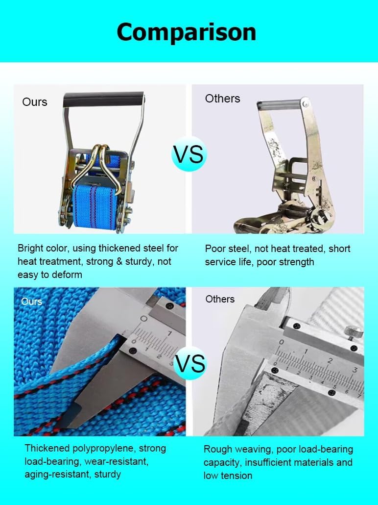 Are you still worried about cargo falling off easily?Heavy duty ratchet straps with steel hooks, tie down straps can be widely used to secure cargo for moving and securing equipment, motorcycles, trucks, vans, kayaks, warehouses, etc.Specifications: Name: Polyester Tie Down StrapsColor: BlueMaterial: Polyester Straps + Steel Frame + Aluminum HandleWidth: 3.8 cm/ 1.5 in, 5 cm / 2 inLength: 1.0 m / 3.3 Ft , 2.0 m / 6.6 Ft , 3.0 m / 9.8 Ft , 4.0 m / 13.1 Ft , 5.0 m / 16.4 Ft , 6.0 m / 19.7 Ft , 7.0 m / 23.0 Ft , 8.0 m / 26.2 Ft , 9.0 m / 29.5 Ft , 10.0 m / 32.8 Ft , 11.0 m /36.1 Ft , 12.0 m / 39.4 Ft , 13.0 m / 42.7 Ft , 14.0 m / 45.9 Ft , 15.0 m / 49.2 Ft , 16.0 m / 52.5 FtApplication: Bundling goods /fixing goods, etc.Features:1. High-density cargo straps are wear-resistant and break-resistant2. Cargo straps are easy to use, not easy to fall off and can be fixed immediately3. Truck straps have an easy-release mechanism to easily release the tension on the straps4. Ratchet straps have double-stitched edges to prevent slipping during use; ensure that the cargo is firmly fixed in place, giving you peace of mind when transporting cargo; reinforced stitching adds extra strength and stability to the straps5. Lashing strap are equipped with double J-hooks for easy fixation6. Tow strap have strong pulling force, 5 tons/11023 lbs7. Tie down straps are widely used, including moving, securing cargo, camping or other tie-down needs, such as warehouses, motorcycles, canoes, kayaks, ATVs, trucks, boxes, furniture, lawn equipment, etcPackage Included:1 x Heavy Duty Ratchet Strap with HookTighten Ratchet Straps Steps:1. Pass the strap under the tensioner rotating shaft2. Pass the strap through the center slot of the tensioner rotating shaft3. Pull the tensioner handle back and forthRelease Ratchet Straps Steps:1. Fasten the safety plate outwards2. Open the tensioner to level3. Pull out the strapNotes:1. Due to manual measurement, there may be a 1-2 cm error, please understand2. Due to different monitors, there may be color differences, please refer to the actual product3. Do not use as a vehicle tow rope, car towing needs to be more load-bearing rope