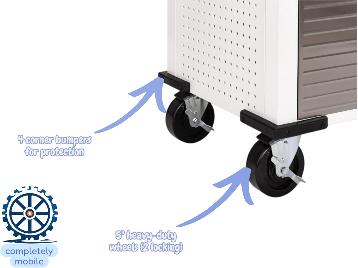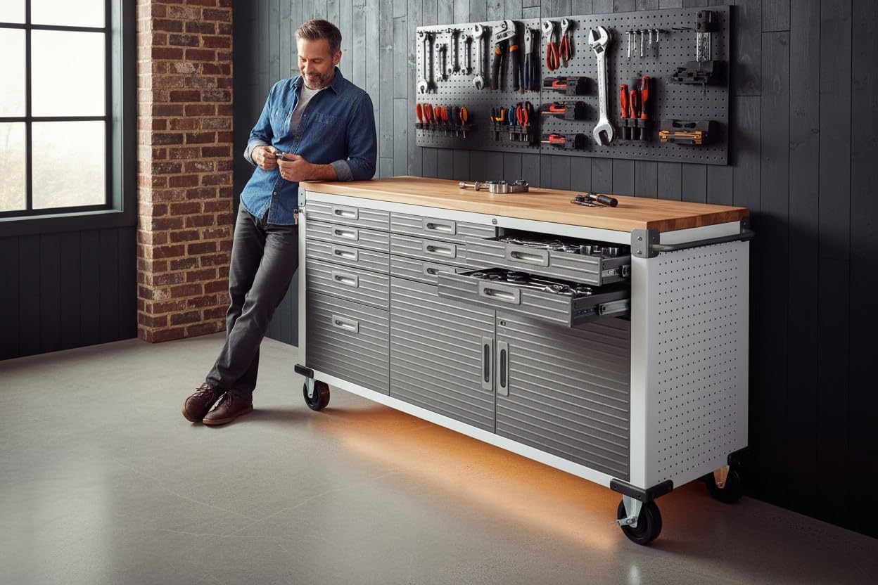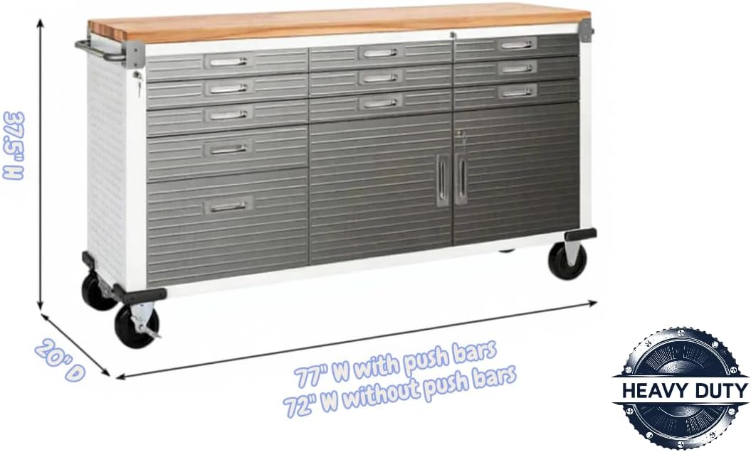 This heavy-duty mobile workbench is the perfect solution for your workshop or garage. Featuring a sturdy steel construction with a durable wood top, it offers ample storage space with 10 drawers and 2 cabinets. The drawers slide smoothly on ball-bearing glides, while the lockable cabinets provide secure storage for tools and supplies. The workbench is mounted on 4 swiveling casters, allowing easy mobility around your workspace. With a spacious 77" x 20" work surface, you'll have plenty of room for projects and repairs. This versatile workbench is a must-have for any DIYer or professional.