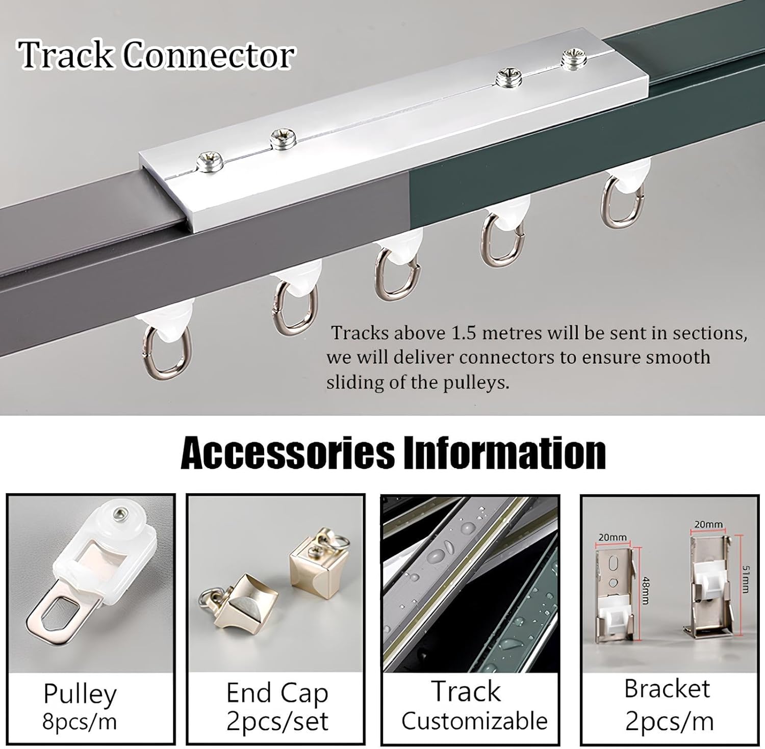 Introducing our premium Curtain Track, expertly crafted from high-quality 6063 aluminum alloy to elevate your space with both style and functionality. Available in a range of colors including black, white, gray, and blue, this curtain track seamlessly complements your decor while providing a modern aesthetic. Its versatile design allows for easy mounting on either ceilings or walls, making it perfect for various environments such as living rooms, bedrooms, kitchens, restaurants, and hotels. The elegant and simple design integrates effortlessly into different interior styles, enhancing the overall ambiance of your home or workspace. One standout feature is its anti-oxidation properties, which contribute to its durability and extended lifespan. Enjoy quick and easy installation, allowing you to hang your curtains without the stress of complicated setups. Experience the smooth and quiet operation that creates a serene atmosphere, whether you are letting in morning light or setting a cozy mood in the evening. For tracks longer than 1.5 meters, we offer them in manageable sections along with connectors to ensure seamless pulley movement. This thoughtful design ensures your curtains glide effortlessly, combining practicality with style. Elevate your home or business with our versatile and durable curtain track, where quality, convenience, and aesthetic appeal come together for an exceptional window treatment solution.