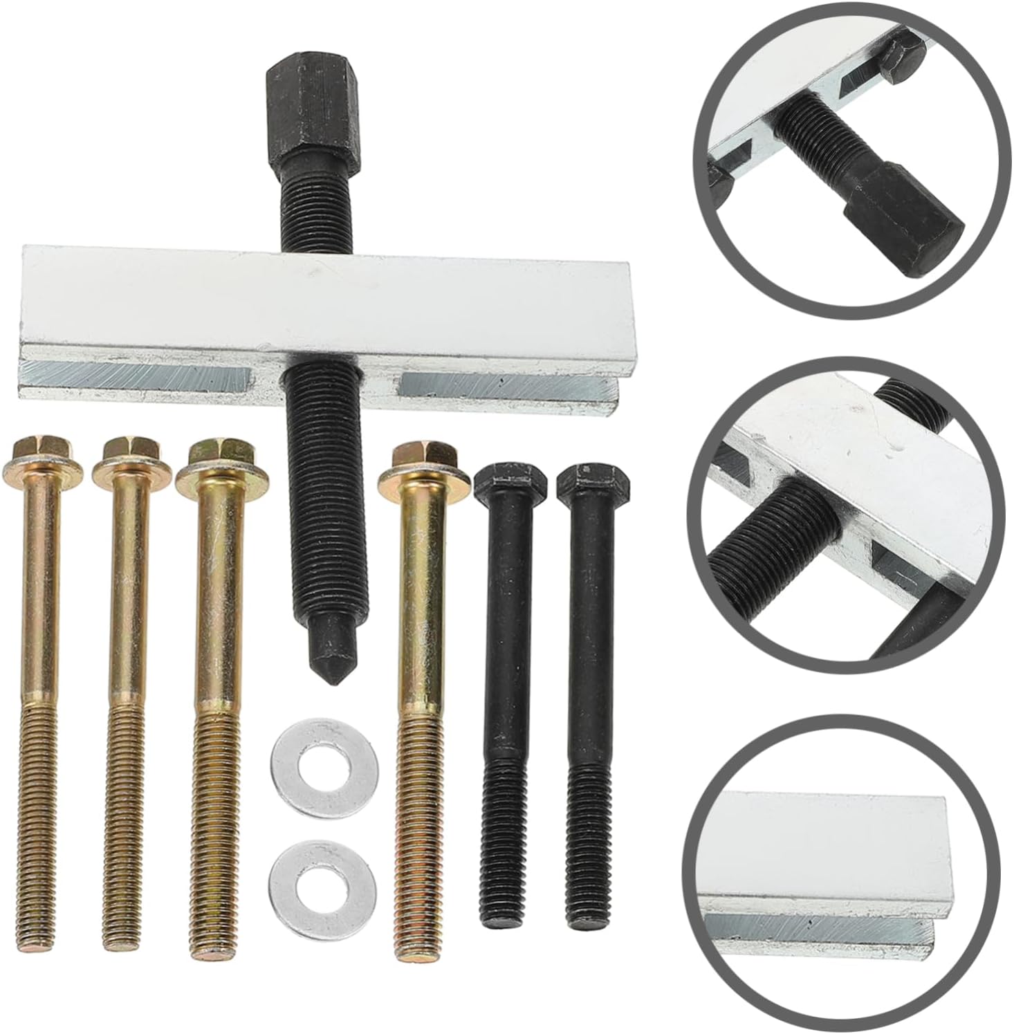 Package List 1 x Timing Gear Puller 6 x Bolts Characteristics -Size:15.00X13.00X2.50cm/5.89X5.11X0 heavy duty puller tool. -Material:Steel brake drum puller -Color:Assorted Color small bearing puller -Its steel construction ensures that it can withstand frequent use and last for a long time pulley. -With a simple design, can use this tool to quickly and efficiently remove crankshaft pulleys puller. -By improving efficiency and productivity in a variety of settings, this tool can help users complete tasks more quickly and puller pullers. -This bearing puller is designed to save time and effort when working on vehicles or machinery heavy duty puller. -Whether you're a mechanic, hobbyist, or DIY enthusiast, this tool is must-have to remove bearing timing gear puller.Goods Descriptiongear puller Designed to make the removal of crankshaft belt pulleys, motor steering wheels quick and easy.bearing pullers Made from steel materials, this tool is reliable and , making it an essential addition to use.puller pusher tool The crankshaft belt puller is a versatile tool that can be used for a variety of vehicles and machinery