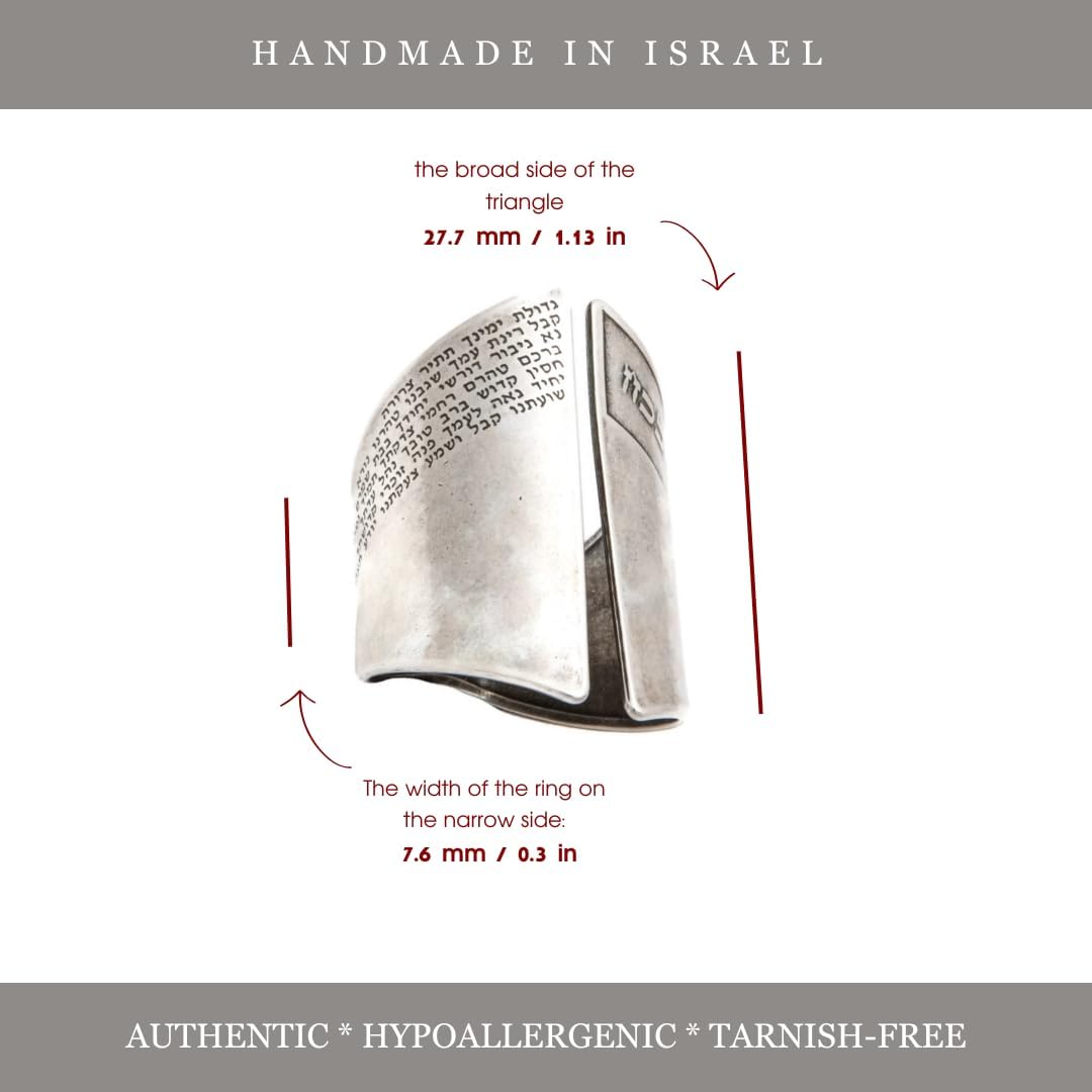 A powerful statement of faith you can wear every day. This 925 sterling silver Hebrew Jewish ring is engraved with the sacred Kabbalah prayer "אנא בכח" – Ana Bekoach, a mystical chant known for personal empowerment, spiritual protection, and inner strength. The unique open geometric design features two triangles that nearly touch — symbolizing divine connection and spiritual alignment. One triangle carries the words "אנא בכח", while the other is engraved with the full Ana Bekoach chant in Hebrew. Handmade in Israel, this ring blends authentic Judaica tradition with modern elegance. Whether worn as:A Jewish prayer ringA Kabbalah meditation ringA Hebrew faith statement ringA meaningful Israeli gift It is more than jewelry — it is intention made visible. Your ring arrives beautifully gift-wrapped, including an explanation of the Hebrew prayer in both Hebrew and English. A small bookmark is included as a thoughtful keepsake. If you are searching for a Jewish ring that carries spiritual meaning, heritage, and presence — this piece will not be ignored. Wear your blessing. Or gift one. Note: Because each piece is handcrafted with love, please allow for minor variations in finish or stone shape. These subtle differences are what make your jewelry uniquely yours.