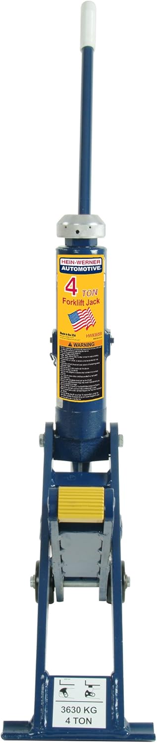Hein-Werner HW93659 forklift jack is a 4 Ton forklift jack assembled in USA. It is designed to raise and lower a forklift. Please use the appropriate support stands once the forklift is raised. The compact design and the removable handle make the storage with the ease.It is built with the strong steel construction, and gives you the ability to raise from the height o f 2-1/2 inch to a maximum height of 16-3/4 inch.Hein-Werner forklift jack also features the two position lift pad to secure the contact point on a variety of surfaces. Also, as the jack is raised and lowered, lift pads adjust with the load plane. - Two-position lift pad for secure contact - Lift pads adjust with load plane as jack is raised and lowered - Height range of 2-1/2 inches to 16-3/4 inches - Assembled in the USA Specifications - Capacity: 4 Ton - Min Height: 2-1/2 inch; Max Height: 16-3/4 inch - Lift Height: 14-1/4 Inch - Handle Length: 29 Inch -Base Size: 8 x 26-1/2 inch - GW: 73 Lbs Hein-Werner HW93659 Forklift Jack is backed by 2 Years warranty from the date of the purchase.