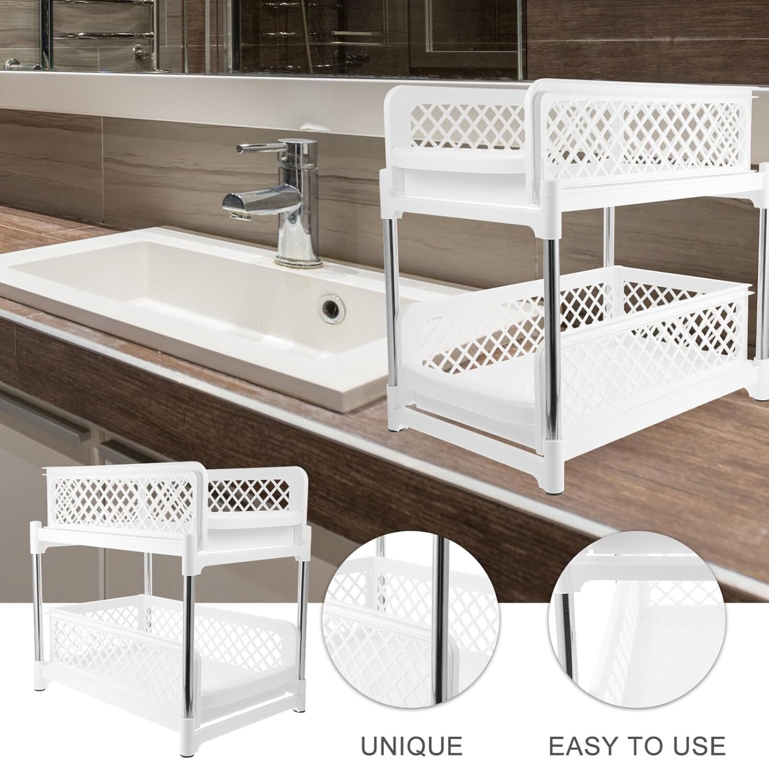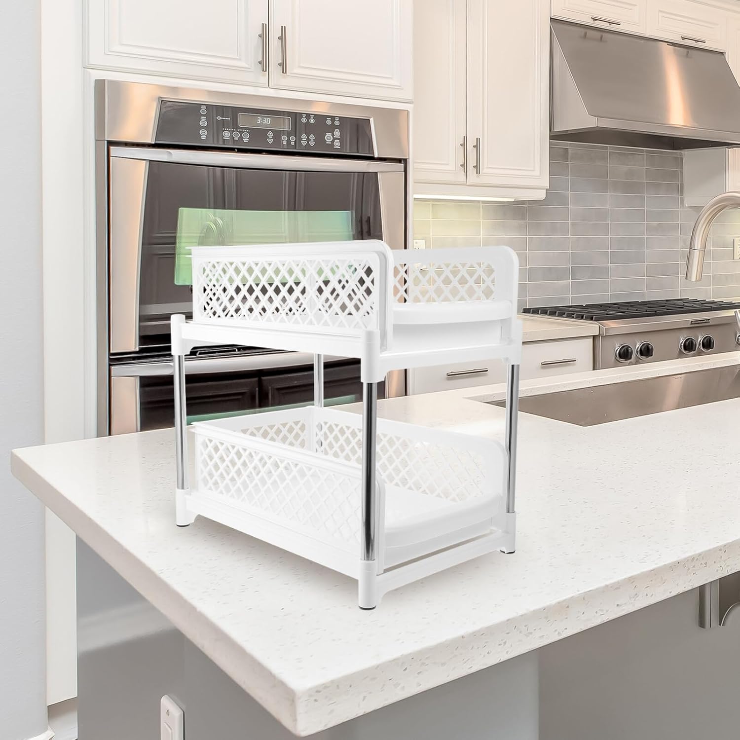 DescriptionAre you annoyed at endless messy kitchen countertops? If you are looking for a multifunctional storage rack, our organizer rack is sturdy and trustworthy enough to do multiple jobs. Dual-layer design, sturdy material, steady structure, it must meet your needs to store seasoning bottles in kitchen, soap, shampoos, in bathroom, etc.Features- Color: White- Material: PP, Stainless steel- Size: 37.20X37.00X26.70cm/14.62X14.54X10.49in【2-Tier Plastic Multipurpose Organizer】- Our bathroom storage organizer is made of sturdy high-hardness ABS plastic and securely linked by thickened stainless steel support tubes, ensuring stability and preventing scratches or movement.【Stackable Design】- Plastic multipurpose organizer is stacked firmly without scratching the top surface. Stack up to multiple units that maximizes storage space in the same footprint【Space-Saving Organizer】- Features 2 removable baskets for easy access to your essentials, and both baskets have 2 adjustable dividers to help further separate your items for easy custom organization.【Removable Dividers】- With the included removable dividers, you could create compartments by your organizational needs, sorting and categorizing various items.【Multipurpose Organizers】- Use as a desk organizer for various office supplies to utilize otherwise unused vertical space or anywhere in the kitchen for your cleaners, spices, snacks, and more.Package Including1 × Kitchen Cabinet Organizer