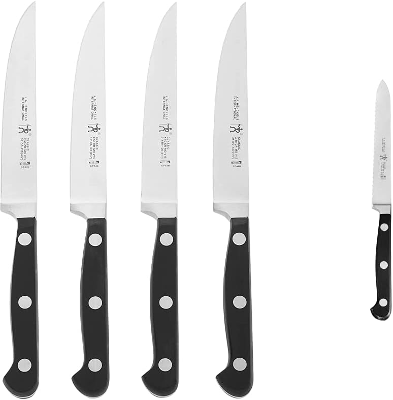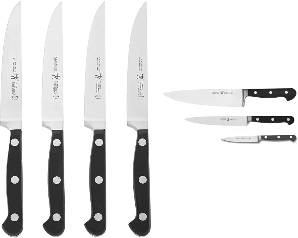 HENCKELS Classic Razor-Sharp Steak Knife 4 Piece Set, German Engineered Informed by 100+ Years of MasteryThe Henckels International CLASSIC 4-pc Steak Knife Set elevates your experience with eating meat. Thanks to fine-edge precision blades, confidently slice steaks, pork chops and chicken cutlets with ease. High-quality German stainless steel strengthens the durable, Spanish-made blades. With a seamless transition from blade to handle, the knives' fully forged construction provides balance as the traditional triple-rivet handles encourage tireless cutting. Henckels International makes essential kitchen tools every home chef needs. From steak knives to spatulas, every product boasts high quality at an exceptional value. Created in 1895 by Zwilling J.A. Henckels, this value-driven brand guarantees the same durability, design and ease of use for which the global company is known. Equip your kitchen with expertise with Henckels International.Set includes 4 - 4.5 inches steak knivesHenckels Classic 8 in Chefs knifeExperience confidence with each cut. The Henckels International CLASSIC 8" Chef's Knife boasts a precision, fine-edge blade that is honed for long-lasting sharpness. Chop potatoes, dice apples, mince shallots and slice salmon effortlessly—this kitchen workhorse is up for almost any task. High-quality German stainless steel strengthens this durable, Spanish-made knife. With a seamless transition from blade to handle, the knife's fully forged construction provides balance as the traditional triple-rivet handle encourages tireless cutting. Henckels International makes essential kitchen tools every home chef needs. From steak knives to spatulas, every product boasts high quality at an exceptional value. Created in 1895 by Zwilling J.A. Henckels, this value-driven brand guarantees the same durability, design and ease of use for which the global is known. Equip your kitchen with expertise with Henckels International. A good chef's knife becomes your daily kitchen companion. It's used for everything from prepping steaks for the grill to finely mincing onions, and chances are you'll reach for it every time you cook--so it better be good. This lower-priced line from Henckels is a great value: excellent quality knives with their standard lifetime warranty. There's good balance, and the handles are a shade heavier than other lines, which some cooks will prefer. The 8-inch blade length is the most practical for multipurpose use, and regular sharpening will keep the stainless-steel blade razor-sharp. It's only minimally flexible, which makes it a great choice for vegetables such as potatoes and turnips. While it's dishwasher-safe, unless it needs sanitizing after use with raw meat, it's often easier to hand wash. --Jill Lightner.
