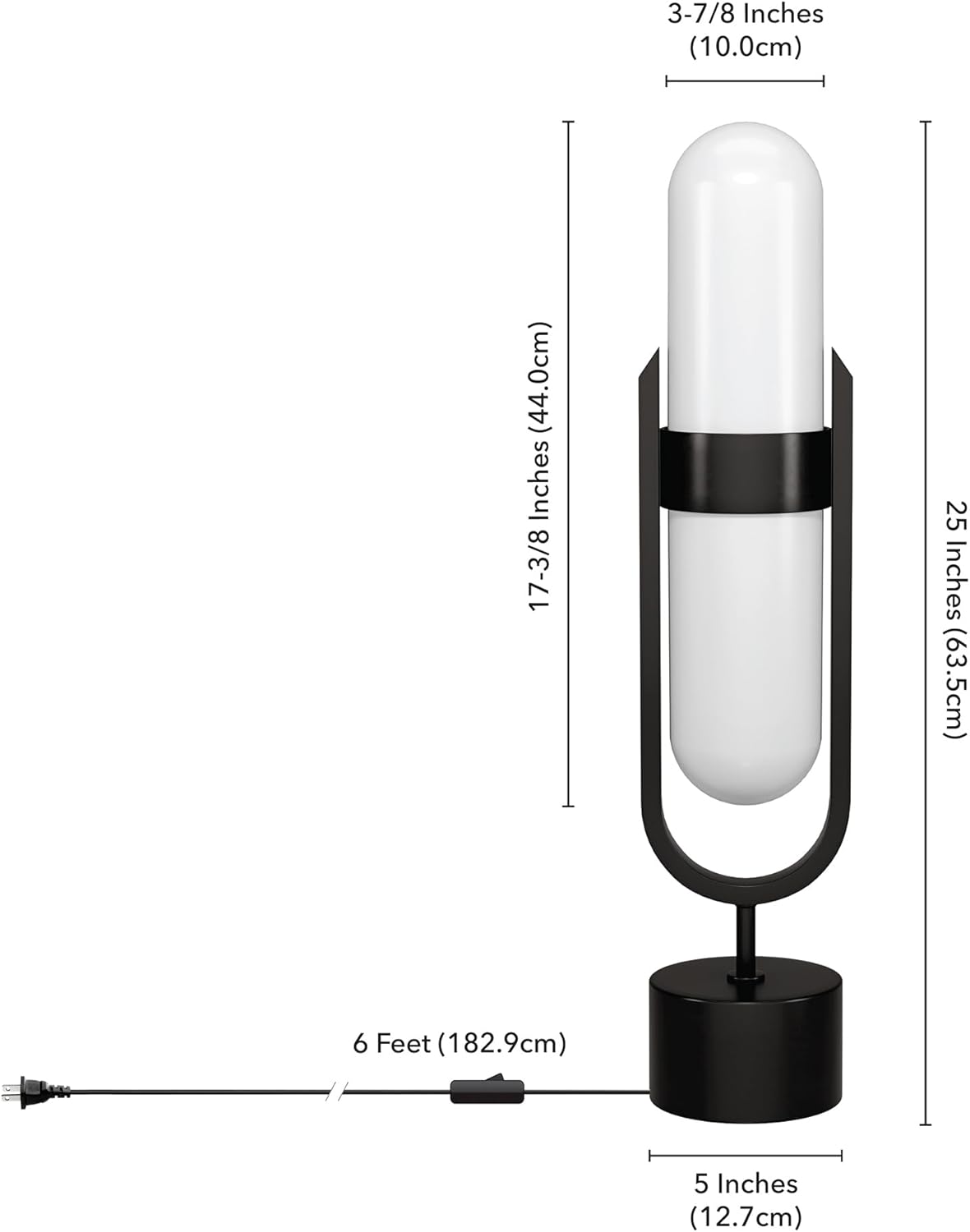 Achieve effortless mid-century retro styling in your space with this design-forward table lamp. The unique combination of a vintage-inspired shade and a sleek, modern base offers a statement piece that will elevate any room. A handcrafted Black finish is applied to the sturdy steel base, which is inspired by the clean lines of a classic microphone holder. This is perfectly complemented by the lamp's defining feature: a pill-shaped shade created by two combined white milk glass cylinder shades. This unique shade provides a soft, diffused glow. Standing at 25 inches tall, this table lamp adds both light and major vintage flair to your living room, bedroom, or office. Designed for convenience, this lamp includes a 6-foot cord and is operated by a simple rocker switch. It is rated for two E26-base, 60W A19 bulbs or LED equivalent. Bulbs are sold separately. The lamp also features easy assembly.