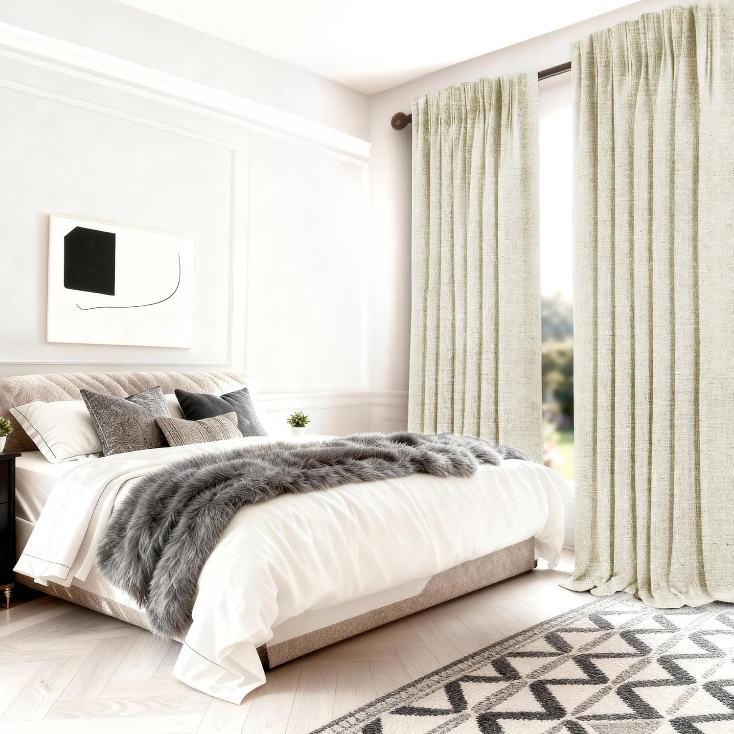 100% Blackout Linen Texture Curtains for Bedroom1.The bedroom curtain fabric holds oeko-tex certification, meeting stringent international environmental standards and ensuring safety for children and pets.2.Ideal for multiple indoor spaces requiring darkness—including living rooms, bedrooms, dining rooms, kitchens, studies,office and nurseries.3.Slight color variations may occur due to differing lighting conditions, weather, or display settings. This is a normal characteristic of the product.4.You will receive: 2 panels curtains & hooks & rings.