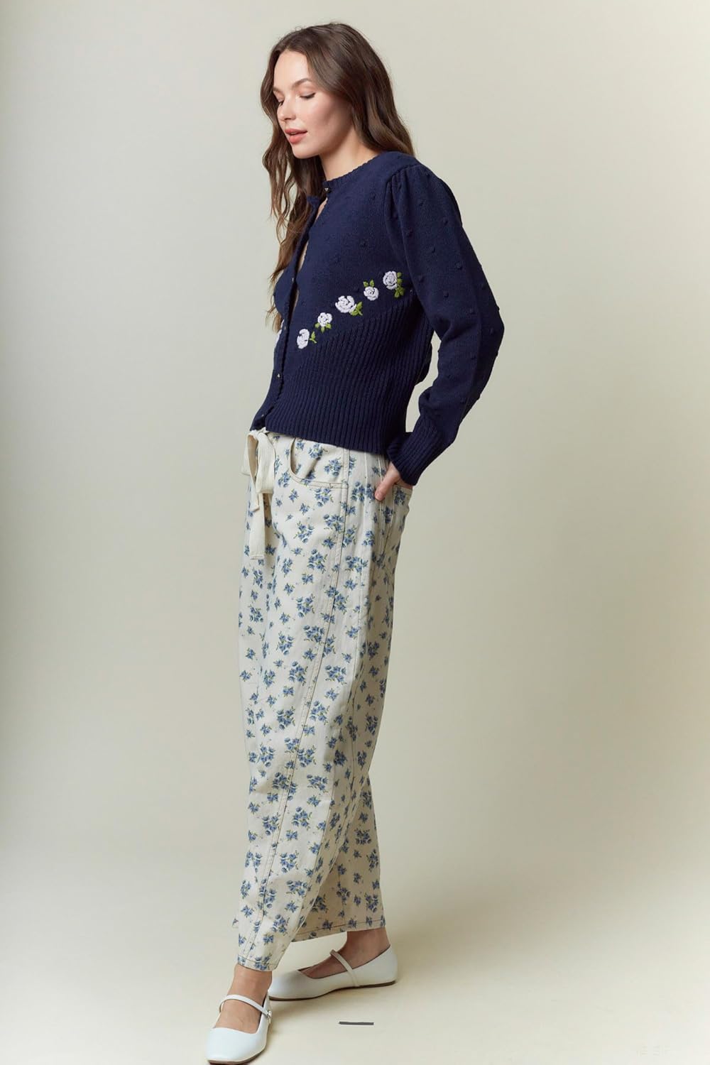 Add playful charm to your denim collection with the Hey Sweetie floral printed waist tie detail denim pants. Made from 100% cotton, these high waist jeans combine soft comfort with a flattering fit. The waist tie detail creates a cinched silhouette, while the floral print brings a touch of feminine style. Pair them with your favorite tees, blouses, or cozy sweaters for weekend outings, casual days, or planning a cute back to school outfit that feels both vintage-inspired and effortlessly modern.