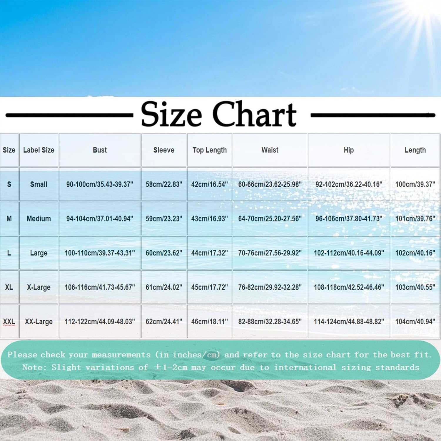 Label Size: Small Bust: 90-100cm/35.43-39.37'' Sleeve: 58cm/22.83'' Top Length: 42cm/16.54'' Waist: 60-66cm/23.62-25.98'' Hip: 92-102cm/36.22-40.16'' Length: 100cm/39.37'' Label Size: Medium Bust: 94-104cm/37.01-40.94'' Sleeve: 59cm/23.23'' Top Length: 43cm/16.93'' Waist: 64-70cm/25.20-27.56'' Hip: 96-106cm/37.80-41.73'' Length: 101cm/39.76'' Label Size: Large Bust: 100-110cm/39.37-43.31'' Sleeve: 60cm/23.62'' Top Length: 44cm/17.32'' Waist: 70-76cm/27.56-29.92'' Hip: 102-112cm/40.16-44.09'' Length: 102cm/40.16'' Label Size: X-Large Bust: 106-116cm/41.73-45.67'' Sleeve: 61cm/24.02'' Top Length: 45cm/17.72'' Waist: 76-82cm/29.92-32.28'' Hip: 108-118cm/42.52-46.46'' Length: 103cm/40.55'' Label Size: XX-Large Bust: 112-122cm/44.09-48.03'' Sleeve: 62cm/24.41'' Top Length: 46cm/18.11'' Waist: 82-88cm/32.28-34.65'' Hip: 114-124cm/44.88-48.82'' Length: 104cm/40.94''